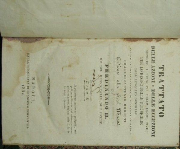 Dell'avvocato generale presso la Corte Suprema di giustiza in Napoli Francescantonio Roberti - Dedicato alla Real Maestà di Ferdinando II Re del Regno delle Due Sicilie - in 8° - pp.XII + 324; 282 + XXIX - Mezza pelle con titolo e fregi in oro al dorso - Due volumi in un tomo - Tagli spruzzati. Prima edizione