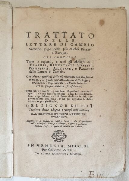 Edizione del 1761 di questo trattato delle lettere di cambio secondo l'uso delle più celebri piazze d'Europa scritto dal bibliotecario e studioso francese Jacques Dupuy (1591-1656). Traduzione a cura di Pietro D'Albizzo Martellini fiorentino. La prima parte ampia descrizione delle lettere di cambio. Alla fine con frontespizio proprio: Metodo di tutti li cambi che si praticano al presente nelle principali piazze dell'Europa e sotto a cadauna Piazza l'uso col quale cambia con le altre. Le piazze italiane indicate: Bergamo, Bolzano, Bologna, Genova, Livorno, Milano, Napoli, Novi, Roma, Torino, Venezia. Amburgo, Amsterdam, Anversa, Augusta Basilea, Berlino, Bordeo, Rremen, Breslavia, Cadice, Colonia, Coppenaghem, Coningsberga, Francoforte, Ginevra, Lipsia, Lisbona, Marsiglia, Madrid Londra, Lione, Parigi ecc. In buone condizioni. Copertina cartonata coeva con titolo manoscritto al dorso in ottime condizioni generali con lievi usure marginali. Legatura in buone condizioni. All'interno le pagine si presentano in ottime condizioni con rare fioriture. In 8. 19,5x13 cm. Pp. XVI+208+72 Edition of 1761 of this treaty of letetrs of change according the most famous cities of change in Europe written by the french librarian and scholar Jacques Dupuy (1591-1656). Translation by Pietro D'Albizzo Martellini from Florence. The first part about the description of leters of change. At the end with its own title page the methods with the change in the most important cities. The cities indicated: Bergamo, Bolzano, Bologna, Genova, Livorno, Milano, Napoli, Novi, Roma, Torino, Venezia. Amburgo, Amsterdam, Anversa, Augusta Basilea, Berlino, Bordeo, Rremen, Breslavia, Cadice, Colonia, Coppenaghem, Coningsberga, Francoforte, Ginevra, Lipsia, Lisbona, Marsiglia MAdrid Londra, Lione, Parigi ecc. In good conditions Carton coeval cover with handwritte title in the spine in very good general conditions lightly worn in the extremities. Binding in good conditions. Inside pages are in very conditions with occasional foxing. In 8. 19,5x13 cm. Pp. XVI+208+72