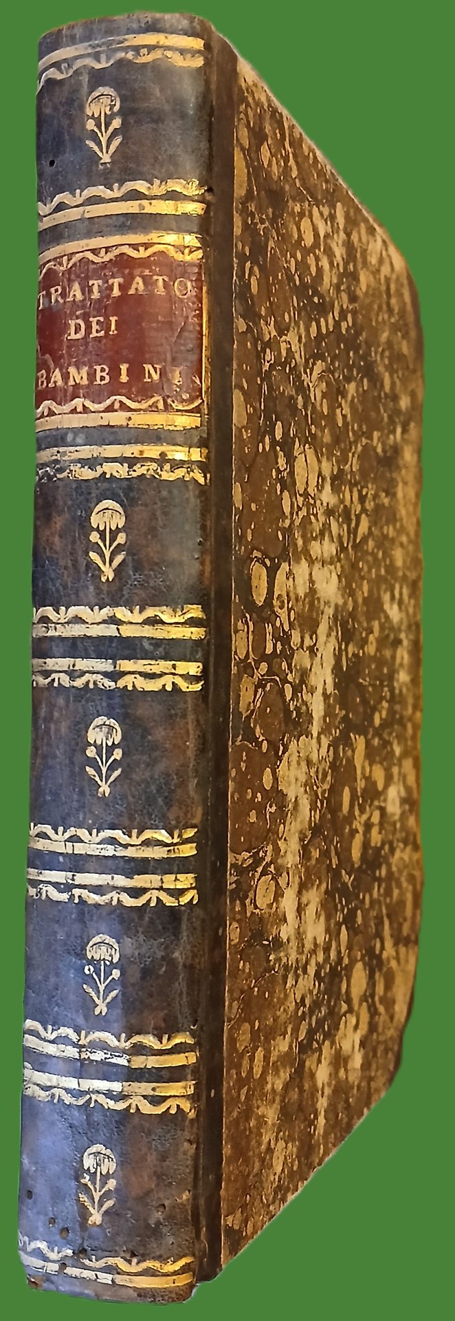 (Pediatria) In 8° antico (cm 17,5 x 12), legatura coeva in mezza pelle marrone scuro con punte, al dorso fregi e filetti ornati impressi in oro, tassello in pelle rossa con titoli dorati, carta marmorizzata monocroma ai piatti, tagli rossi, pp. VIII,439,(1), con marca tipografica al frontespizio ed una testatina xilografica figurata. Volume solido e ben conservato.