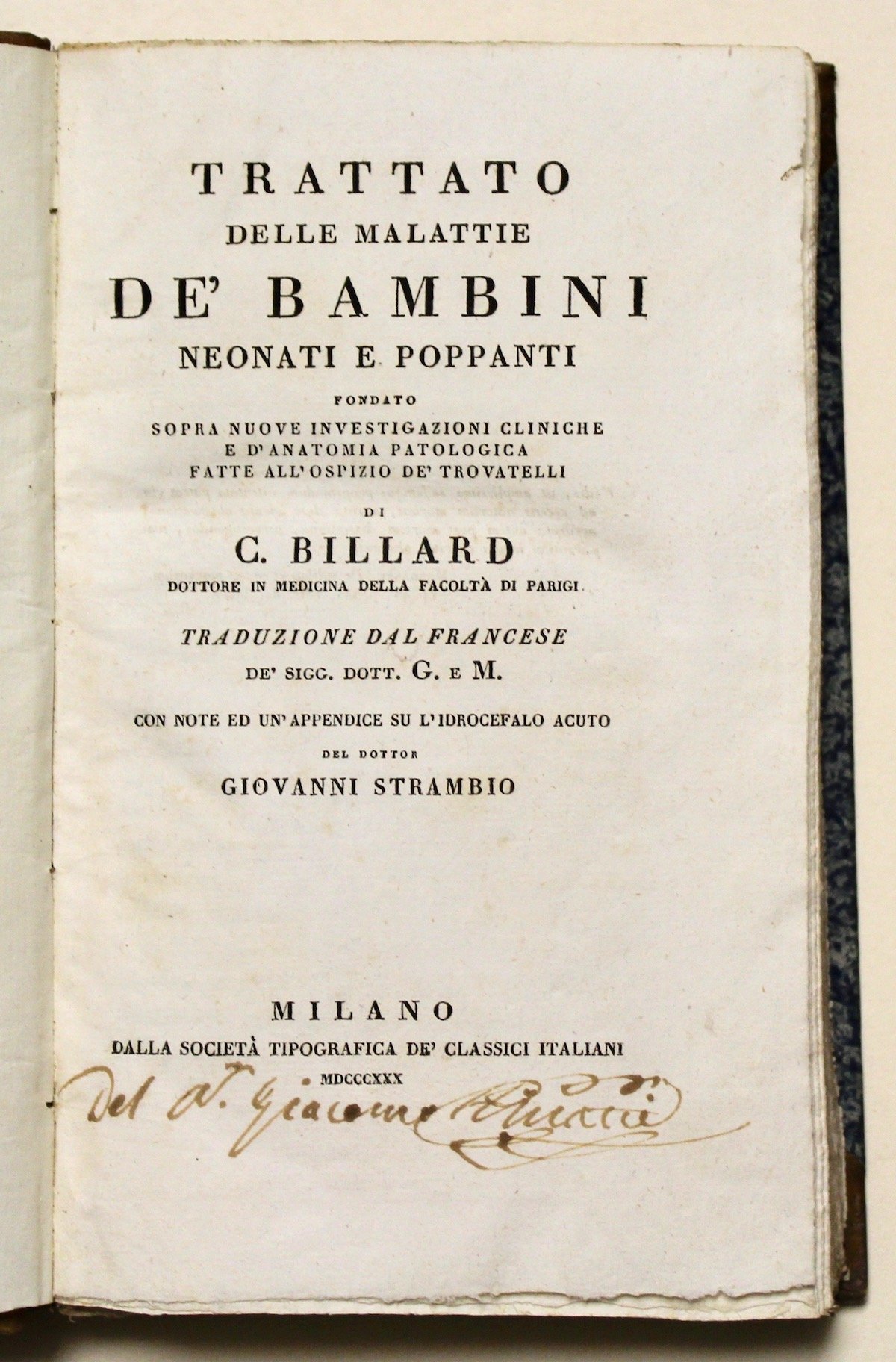 In 8° (mm 222x134); pagg. (6), 577, (6). Mezza pelle coeva con eleganti fregi impressi al dorso in oro, titolo su tassello amaranto, piatti marmorizzati blu. Interessante opera di C. Billard (1800-1832) considerato il pioniere della medicina perinatale, tradotta dal francese con note e un' appendice su l'idrocefalo acuto del medico G. Strambio: il focus di questo trattato è l'esposizione dei sintomi caratteristici delle malattie principali dei bambini e delle loro relazioni con le alterazioni organiche. Ottimo esemplare in barbe, firma di posssesso al frontespizio a inchiostro bruno. Garrison & Morton, 2285.1 e 6332 (edizioni del 1828); Walleriana 1060 (edizione del 1835)<BR>