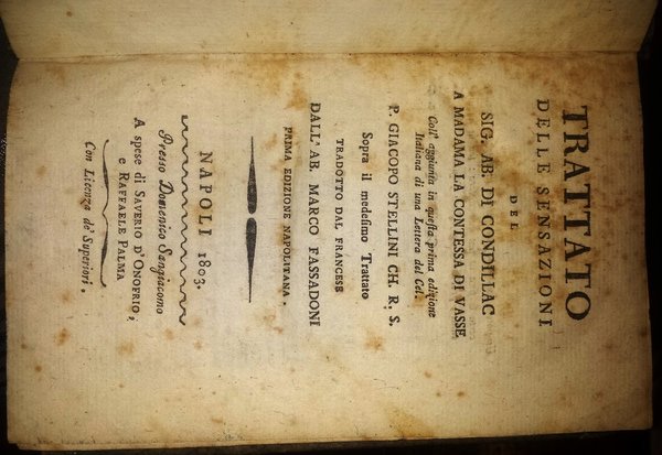Trattato delle sensazioni del Sig. Ab. di Condillac a madama la contessa di Vasse coll'aggiunta in questa prima edizione italiana di una lettera del Cel. P. Giaocopo Stellini Ch. R.S. sopra il medesimo trattato tradotto dal francese dall'Ab. Marco Fassadoni. Prima edizione napolitana. Tomo I-II
