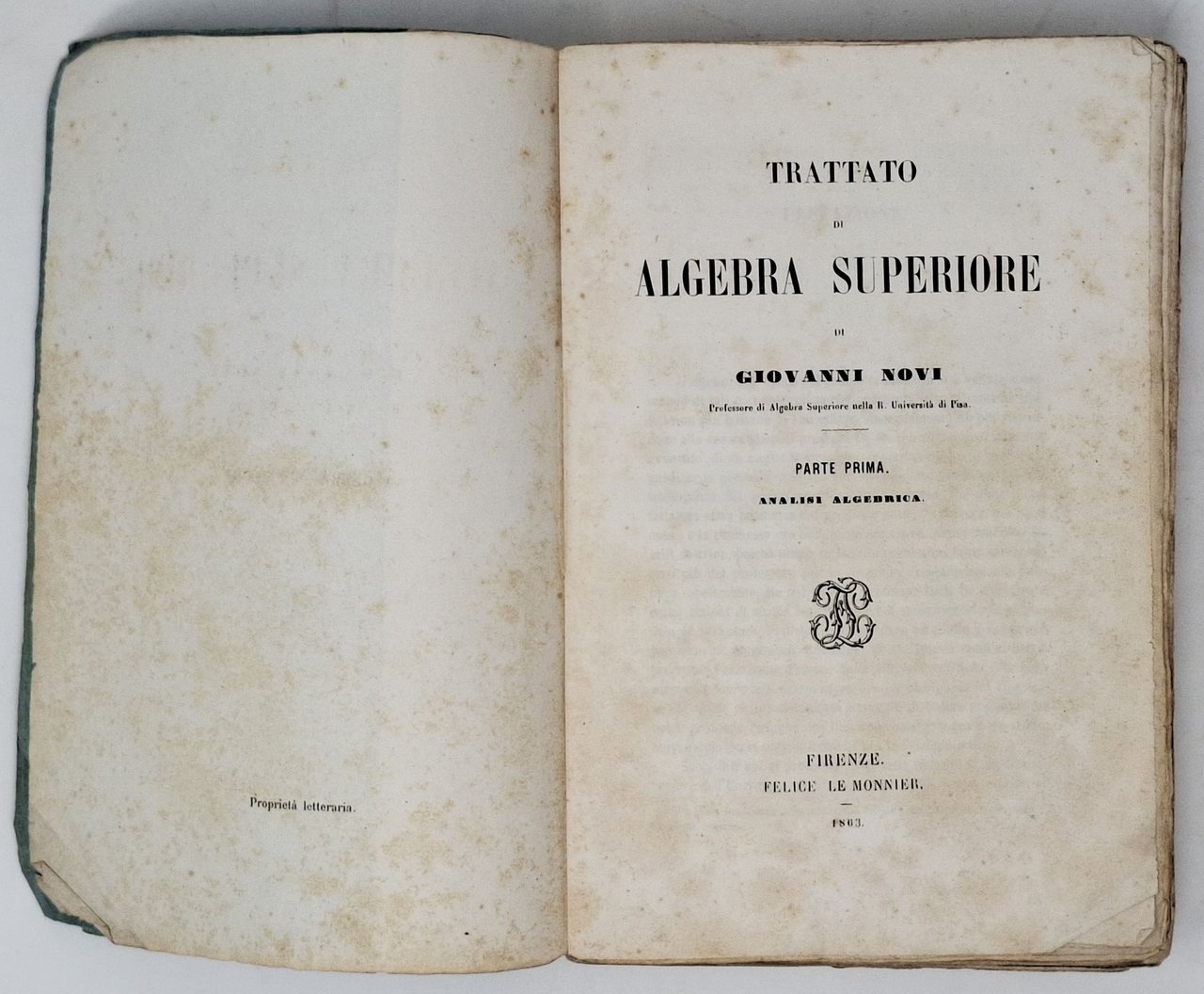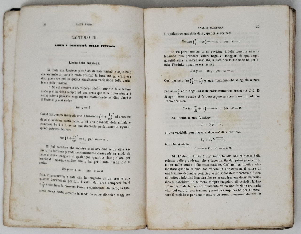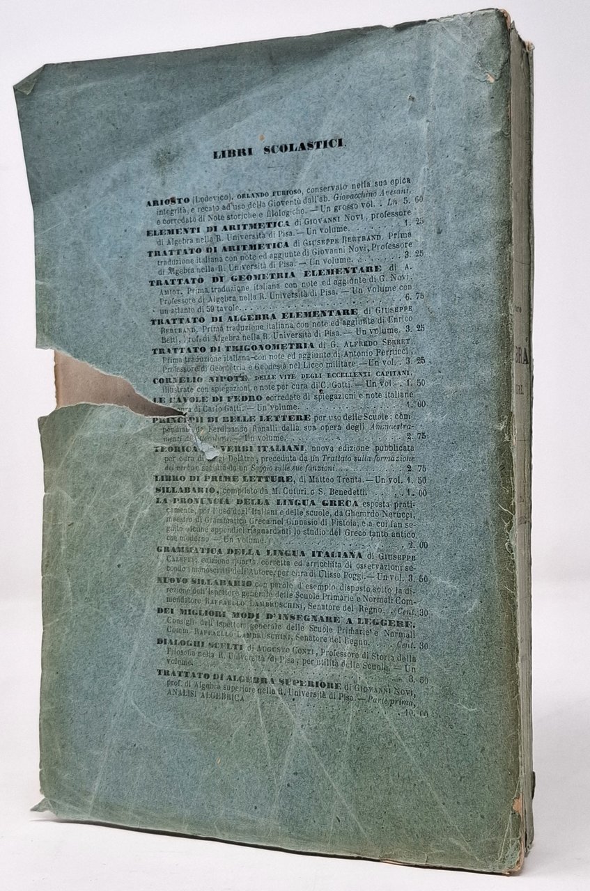Pagine: VIII + + 456 + [2]. Formato: 14,5 x 22 cm circa. Stato di conservazione: segni di usura sulla delicata brossura che presenta qualche mancanza sul dorso e una mancanza più evidente sulla copertina posteriore, diffusi ingiallimenti (però non deturpanti), piccole 'orecchiette', piccola correzione a penna su pagona 161 ma, nel complesso, un buon esemplare. Privo di firme d'appartenenza e timbri. Copertina e frontespizio portano l'indicazione 'parte prima' in quanto era intenzione dell'autore proseguire l'opera, cosa che gli fu impedita dalla prematura morte. Questo resta, dunque, l'unico volume di quest'opera pubblicato. In brossura con copertina flessibile azzurra con titolo entro cornicetta. Importante opera, anche per l'impulso che diede agli studi di matematica superiore in Italia.