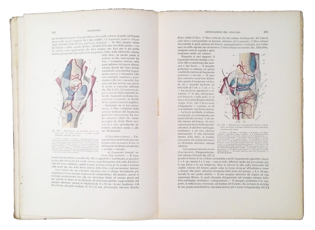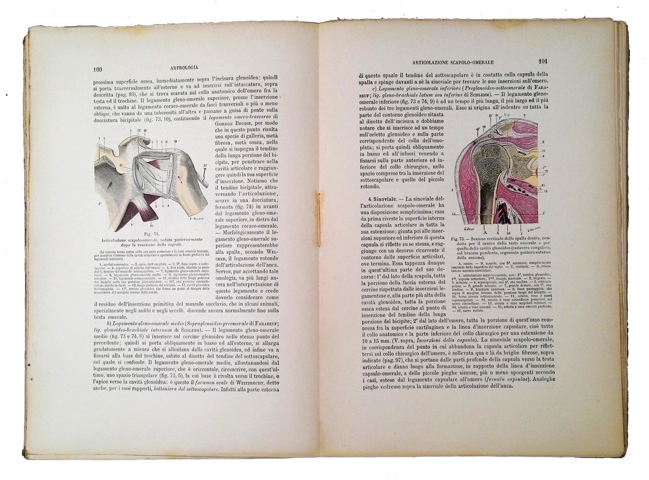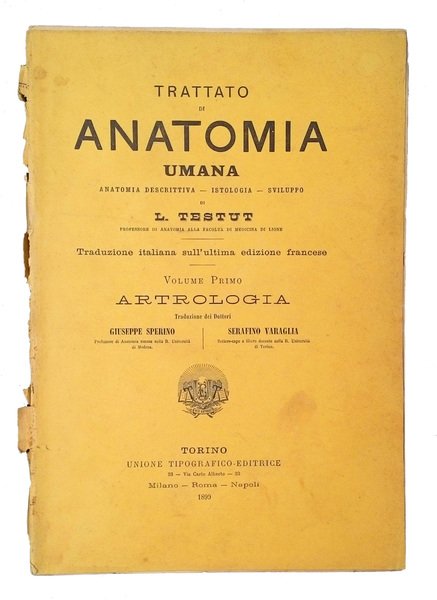 Opera in 8 vol. (su 9) (274x188 mm); leg. in brossura ed. in carta leggera color sabbia con titolo al piatto ant. (presenti solo parte o frammenti dei piatti, niente dorsi, fascicoli slegati); l'opera comprende i seguenti volumi: 1: Testa, colonna vertebrale, collo, torace/ L. Testut, O. Jacob/ Torino, 1906 (pp. 854); 1.1: Osteologia/ L. Testut; traduzione dei dottori Giuseppe Sperino, Serafino Varaglia/ Torino, 1901 (pp. XVI, 396); 1.2: Artrologia/ L. Testut; traduzione dei dottori Giuseppe Sperino, Serafino Varaglia/ Torino, 1899 (pp. 250); 1.3: Miologia/ L. Testut; traduzione del dottore Giuseppe Sperino/ Torino, 1900 (pp. 384); 2.1: Angiologia/ L. Testut; traduzione del dottore Giuseppe Sperino/ Torino, 1902 (pp. 415); 2.2: Neurologia: 1. sistema nervoso centrale/ L. Testut; trad. di Giuseppe Sperino/ Torino, 1898 (pp. 526); 2.3: Neurologia: 2. Sistema nervoso periferico / L. Testut; traduzione di Serafino Varaglia/ Torino, 1898 (pp. 266); 2.4: Organi dei sensi/ L. Testut; traduzione del dottore Giuseppe Sperino/ Torino, 1899 (pp. 392); 4: Apparati della digestione, della respirazione e della fonazione/ L. Testut; traduzione del dottore Giuseppe Sperino/ Torino, 1903 (pp. 556). Manca solo il volume 3: Apparato uro-genitale, embriologia/ L. Testut; traduzione del dottore Giuseppe Sperino/ Torino, 1905 (pp. 608). Opera con numerosissime figure illustrate b/n e a colori. Importante e fondamentalei testo universitario di anatomia umana dei primi del 1900. Rif.: IT\ICCU\TO0\0359346. Cond.: Carta con leggere bruniture; a parte i problemi di legatura (fascicoli pressocchè slegati) e la mancanza di un volume, trattasi di un'opera in discrete condizioni generali. -- IMPORTANT AND ESSENTIAL UNIVERSITY TEXTBOOKS ON HUMAN ANATOMY OF THE EARLY 1900S, WRITTEN BY TESTUT AND JACOB. Slight browning and foxing at leaves; very loose binding (partially unstitched quires; spines damaged or almost missing; boards worn); lack of a volume; but, overall, it is fair set.