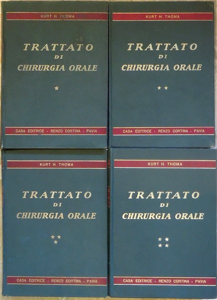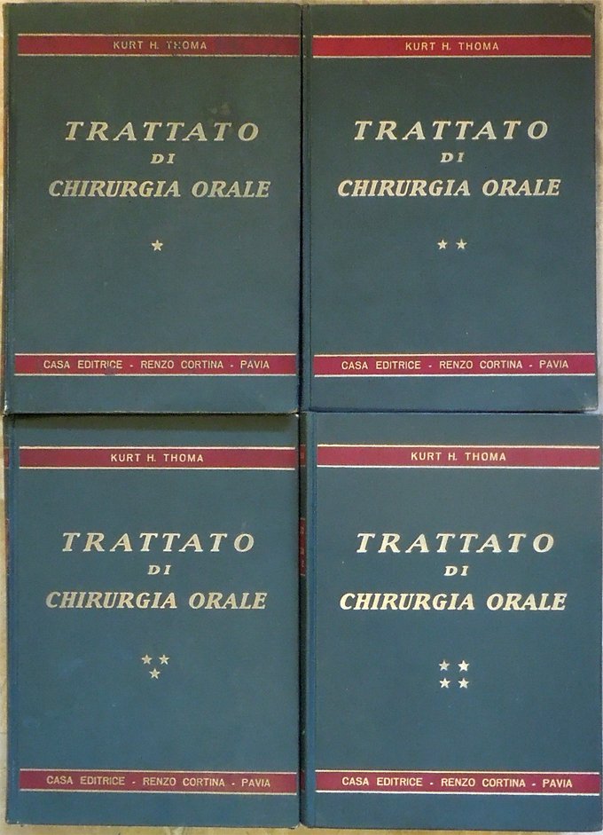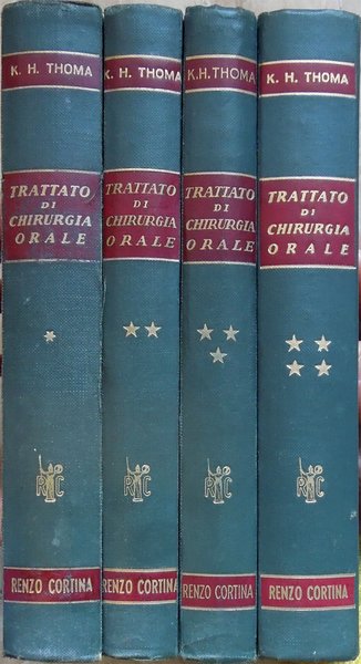 Quattro volumi in-8° (24 x 17,1 cm), pp. con numerazione continua 620; 621-1088, 1089-1512; (8), 1513-2136, (4), legatura editoriale con titoli al piatto anteriore e al dorso. Qualche segno d'uso e del tempo alla legatura, in particolare, fessurazione alla cerniera anteriore del primo volume e a quella posteriore del terzo volume, ben sistemata da piccolo intervento di restauro. Con complessive 1824 illustrazioni nel testo, a colori e, in prevalenza, in bianco e nero. Ai primi tre volumi, alcune piccole, leggere abrasioni ai margini bianchi di poche pagine, dovute alla rimozione di aderenze tra le pagine, aderenze provocate dall'azione dell'umidità sulla carta lucida del volume. Firma d'appartenenza nell'angolo superiore del recto della guardia anteriore di tutti i volumi. Un piccolo strappo nel margine superiore del foglio con le pagine 553-554 del volume primo e due strappi, sempre nel margine superiore, dei fogli 1419-1420 e 1449-1450 del volume terzo, in tutti i casi, lontano dal testo, ben rimarginati con filmoplast. Alle pagine 1426-1429 del volume terzo alcune righe sottolineate a penna blu. Per il resto, ben conservato. Nota di spedizione: il peso complessivo dei volumi, debitamente imballati per l'invio, supera i 5 chilogrammi. Indice: Volume primo (1959). Prefazione all'edizione italiana. Presentazione dell'editore. Nota dei traduttori. Prefazione alla terza edizione. Prefazione alla prima edizione. 1. Le basi fondamentali della chirurgia. 2. Trattamento generale del paziente. 3. Esame radiografico delle ossa facciali e dei mascellari. 4. Farmacologia. 5. Anestesia. 6. Avulsioni semplici e con alveolo-plastica. 7. Chirurgia del parodonto e della regione periapicale. 8. Trattamento di alterazioni e deformazioni dei mascellari edentuli. 9. Avulsione di denti inclusi e ritenuti. 10. Eruzione chirurgica, riposizione, trapianto e reimpianto di denti. Volume secondo (1959). 11. Trattamento delle affezioni traumatiche dei mascellari. 12. Terapia delle affezioni dell'articolazione temporo-mandibolare. 13. Terapia delle affezioni odontogene del seno mascellare. Volume terzo (1960). 14. Terapia dei processi osteomielitici ed osteitici, e della necrosi dei mascellari. 15. Trattamento degli ascessi e delle infezioni facciali e cervicali. 16. Il trattamento delle malattie delle ghiandole salivari e delle ghiandole mucose. 17. Il trattamento delle affezioni del quinto e del settimo paio di nervi cranici. 18. Il trattamento delle cisti dei mascellari. Volume quarto (1960). 19. Il trattamento dei tumori benigni del cavo orale e dei mascellari. 20. Il trattamento dei tumori maligni. 21. Terapia chirurgica delle malformazioni maxillo-facciali. 22. Terapia dei difetti ossei acquisiti. 23. Il trattamento delle anomalie e dei difetti orali.
