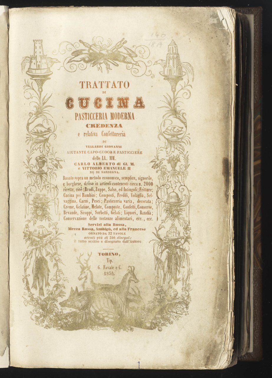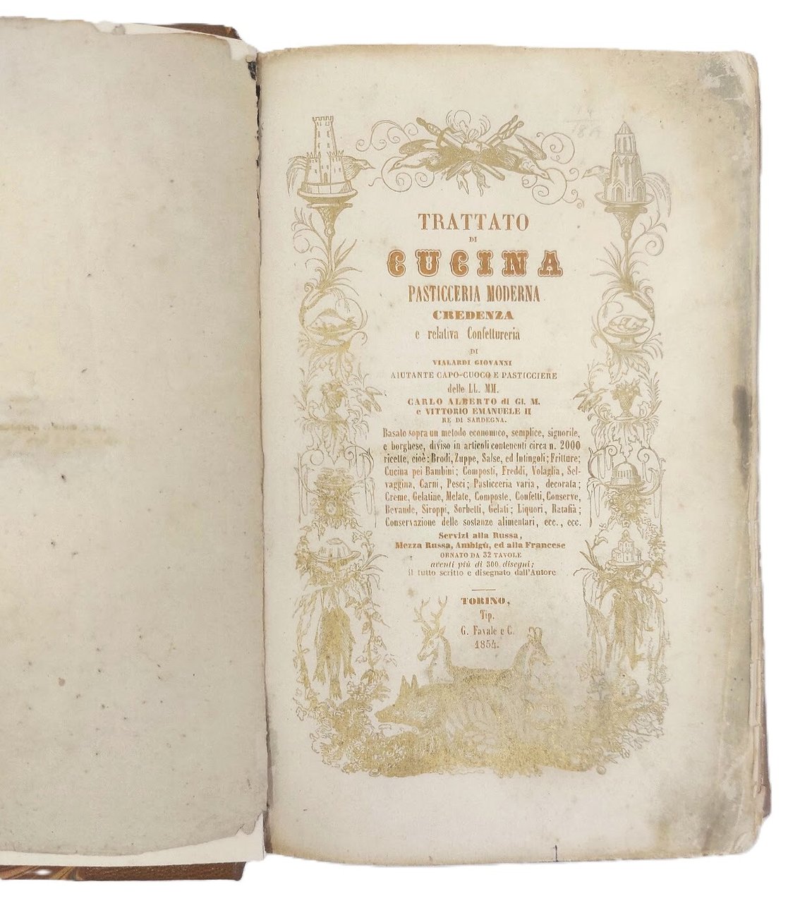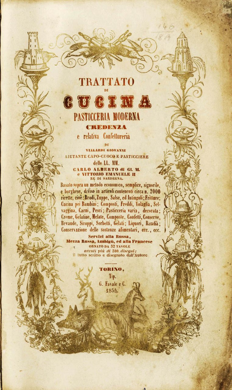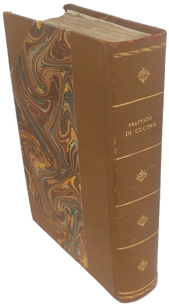 >in-4, pp. (2), 622 su 662 (mancando l'indice), legatura moderna in mezza pelle e angoli. Completo delle 32 tavole f.t. con oltre 300 disegni, eseguiti personalmente dal Vialardi, che conferiscono un'immediatezza didascalica sconosciuta nei manuali dell'epoca. Frontespizio incorniciato da vignette con immagini di vivande, arredi da tavola e cacciagione, il tutto stampato in oro. Prima edizione di questo noto ricettario in cui per la prima volta si utilizzano misure e pesi espressi con il sistema metrico decimale (p. 1). Il trattato fu particolarmente innovativo anche perché conteneva numerose ricette per bambini e promuoveva la conservazione dei cibi sottovuoto. Sono inoltre frequenti le ricette piemontesi, valdostane, nizzarde, genovesi e sarde, cioè di quelle aree che facevano parte del Regno di Sardegna. Il Vialardi si dimostra esigente nel raccomandare ingredienti freschi di prim'ordine, e abile nell'organizzare pranzi serviti alla francese o alla russa, completati dai vini più raffinati. Il presente lavoro fu composto dal Vialardi subuto dopo essere andato in pensione nel 1753 dopo trent'anni al servizio alla Corte Sabauda di Carlo Alberto e Vittorio Emanuele II. E' conservata, seppur con mancanze agli angoli, l'elegante brossura anteriore, impressa in oro su fondo nero, che riprende la bordura del frontespizio. Buon esemplare, purtroppo mancante dell'indice. B.I.N.G. 2039. Westbury 222.