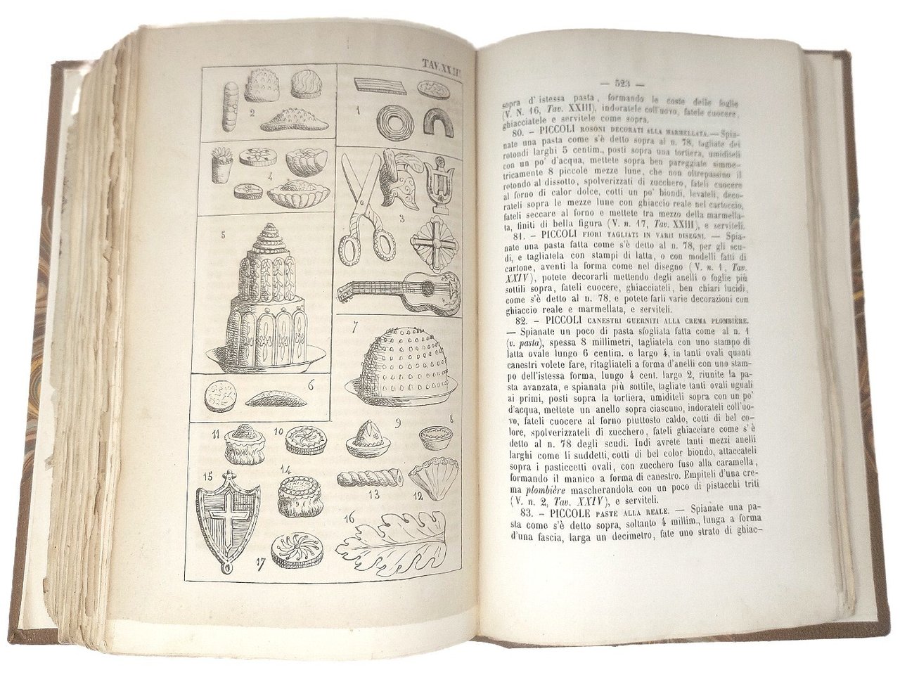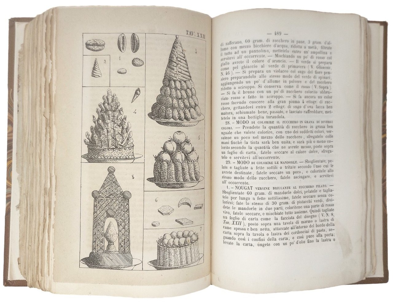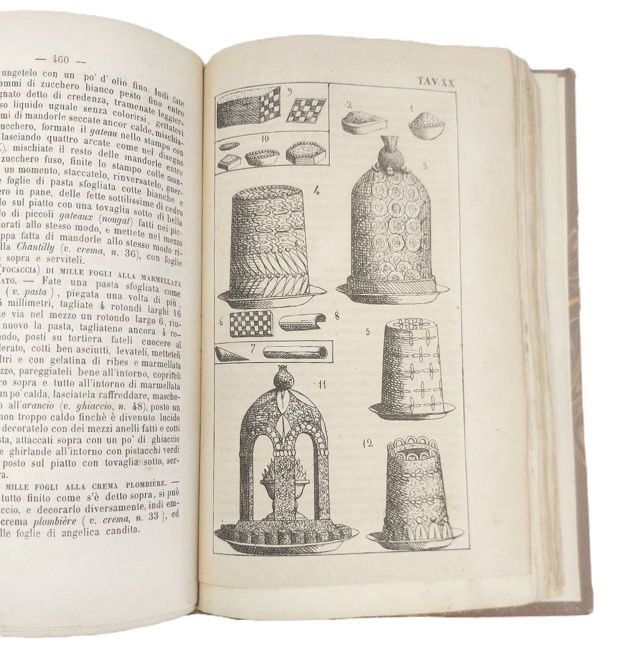 >in-4, pp. (2), 622 su 662 (mancando l'indice), legatura moderna in mezza pelle e angoli. Completo delle 32 tavole f.t. con oltre 300 disegni, eseguiti personalmente dal Vialardi, che conferiscono un'immediatezza didascalica sconosciuta nei manuali dell'epoca. Frontespizio incorniciato da vignette con immagini di vivande, arredi da tavola e cacciagione, il tutto stampato in oro. Prima edizione di questo noto ricettario in cui per la prima volta si utilizzano misure e pesi espressi con il sistema metrico decimale (p. 1). Il trattato fu particolarmente innovativo anche perché conteneva numerose ricette per bambini e promuoveva la conservazione dei cibi sottovuoto. Sono inoltre frequenti le ricette piemontesi, valdostane, nizzarde, genovesi e sarde, cioè di quelle aree che facevano parte del Regno di Sardegna. Il Vialardi si dimostra esigente nel raccomandare ingredienti freschi di prim'ordine, e abile nell'organizzare pranzi serviti alla francese o alla russa, completati dai vini più raffinati. Il presente lavoro fu composto dal Vialardi subuto dopo essere andato in pensione nel 1753 dopo trent'anni al servizio alla Corte Sabauda di Carlo Alberto e Vittorio Emanuele II. E' conservata, seppur con mancanze agli angoli, l'elegante brossura anteriore, impressa in oro su fondo nero, che riprende la bordura del frontespizio. Buon esemplare, purtroppo mancante dell'indice. B.I.N.G. 2039. Westbury 222.