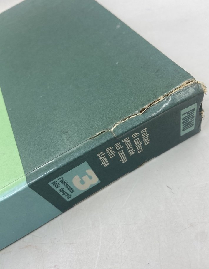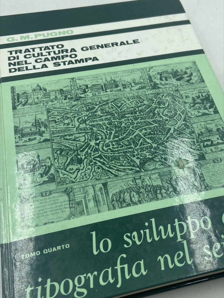 I cinque volumi dell’opera in edizioni diverse, il secondo in brossura e gli altri cartonati (difetti sulla cerniera posteriore del terzo). Tomo primo: La Preistoria. Evo antico e moderno. Progresso Grafico Editore 1974; pp 596 (2), 428 figure in nero nel testo (una in bicromia su tavola ripiegata). Tomo secondo: La tipografia del periodo eroico. Società Editrice Internazionale 1985; pp (4) 516 (8), 223 illustrazioni in nero e a colori. Tomo terzo: L’adolescenza della tipografia. SEI 1967; pp VIII 543 (1), 287 figure in nero; difetto sulla cerniera posteriore. Tomo quarto: Lo sviluppo della tipografia nel Seicento. SEI, 1968; pp VIII 503 (1), 463 illustrazioni in nero; piccolo difetto sul piatto anteriore. Tomo quinto: Lo sviluppo della tipografia - il Settecento. SEI, 1969; pp VIII 634 (2), 450 illustrazioni in nero. Tutto il pubblicato di questo grande affresco storico dell’arte della stampa. G. M. Pugno, ingegnere, fu docente di meccanica razionale e scienza delle costruzioni, e a lungo preside della Facoltà di Architettura del Politecnico di Torino; nell’ultima parte della sua carriera fu direttore della Scuola a Fini Speciali di Scienze ed Arti nel campo della Stampa presso il Politecnico di Torino (1962-1975).