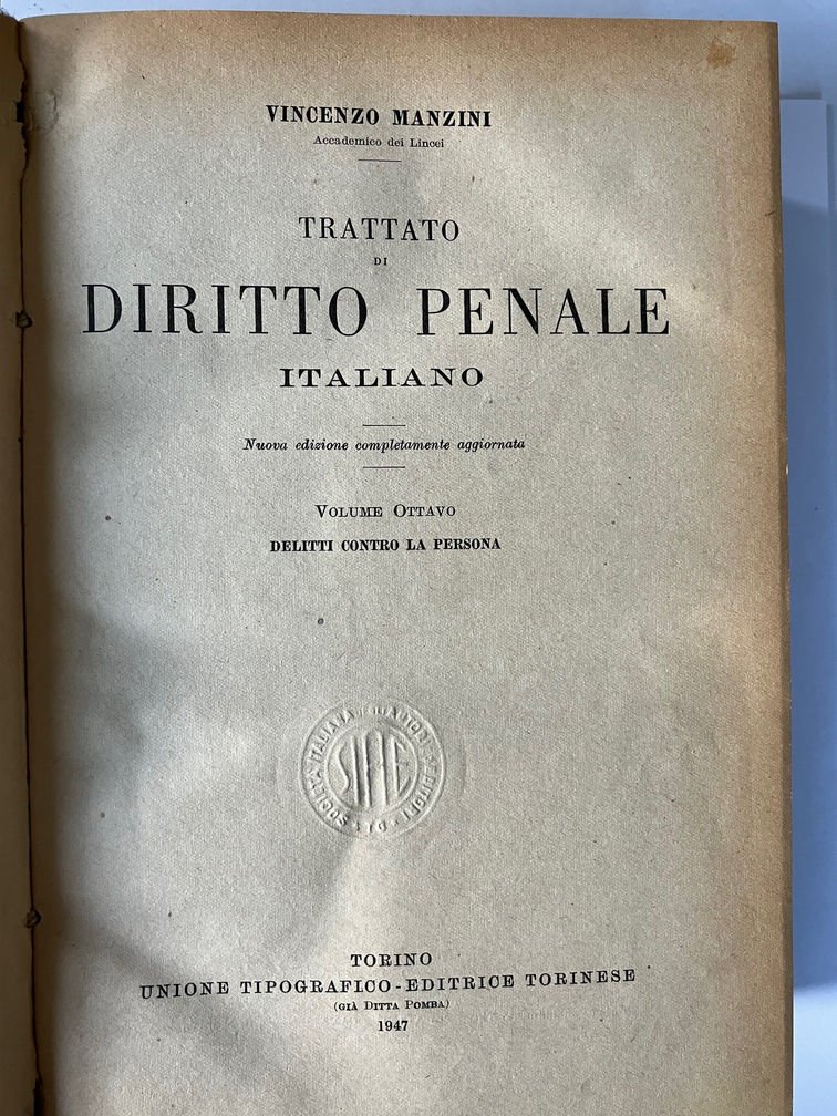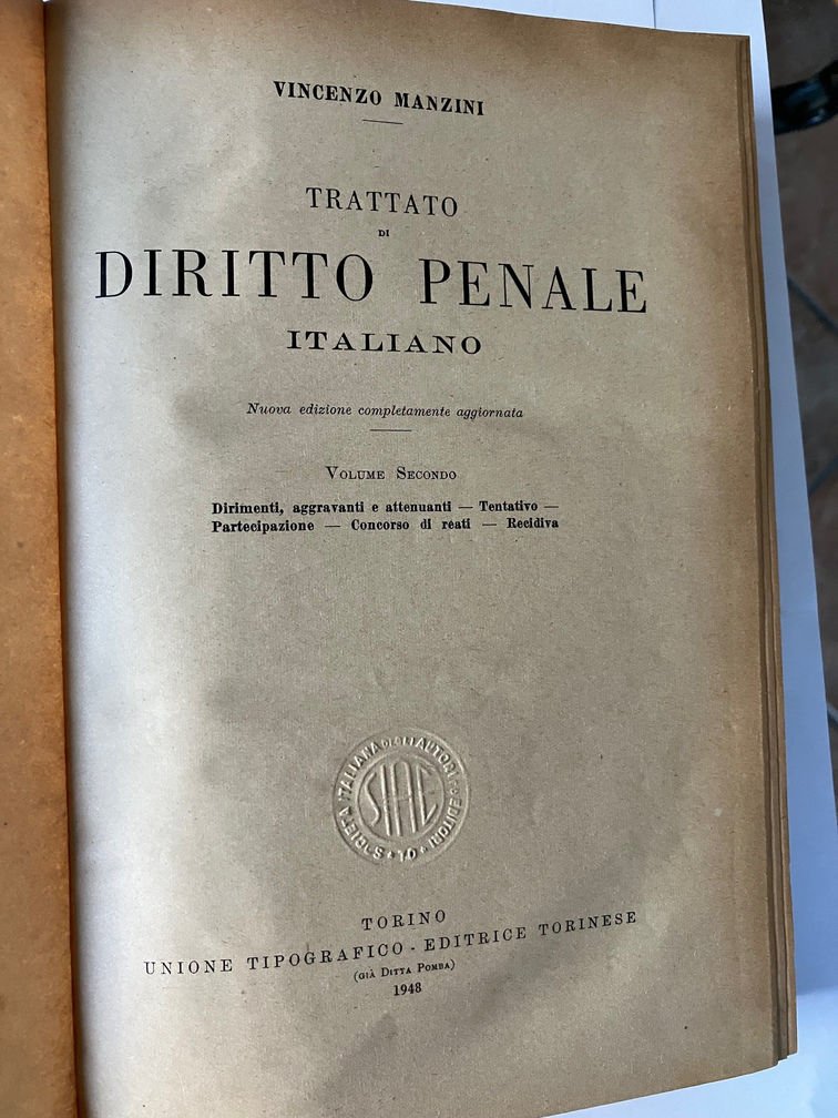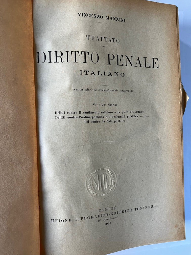 Voll. I; III; IV; V. Vol I la scienza del diritto penale; Vol III: pene, Misure di sicurezza; Vol IV delitti contro la personalità dello Stato; Vol V dei delitti contro la pubblica amministrazione. Mnca il volume secondo (1.XVII.8).