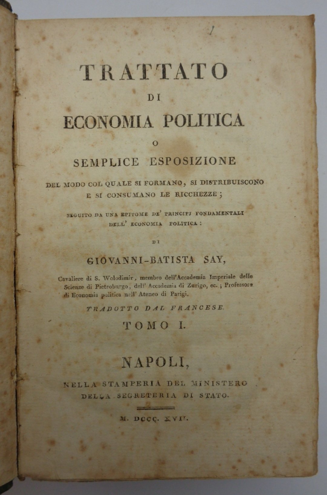 Prima edizione italiana. Tre volumi (13x21 cm) di CI-341 + (4-)363 + (4-)291 pagine. Una tabella ripiegata al volume 3, che contiene in fine anche il testo EPITOME de' principi fondamentali dell'economia politica. Fioriture diffuse più insistenti all'inizio e alla fine dei volumi. Bella legatura coeva in mezza pelle verde, piatti con carta marmorizzata, dorso liscio ornato e dorato (un'etichetta applicata). Importante prima edizione italiana del trattato di Say, testo fondamentale nella storia del pensiero economico liberista.