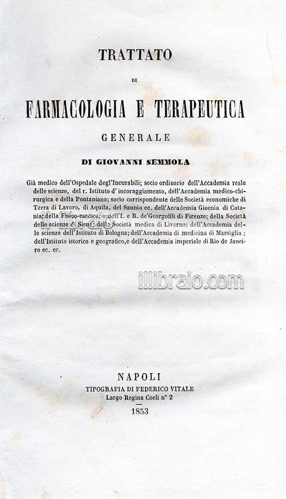in 8°; pp. XVI, 576; leg. in tutta tela azzurra con titolo e fregi in oro al dorso, impressioni a secco ai piatti; 1^ ed. L'Autore (1793 - 1865), fu uno dei capi della scuola clinica napoletana. Allievo del Magendie a Parigi, fu anche uno dei principali assertori della farmacologia sperimentale, concetto espresso in questa sua opera, che è anche la sua fondamentale. (Pazzini, II/411. Castiglioni, 608). La scienza farmacologica, grazie a lui, acquisterà una solida base sperimentale (Porter: Diz. biogr. della storia della medicina)