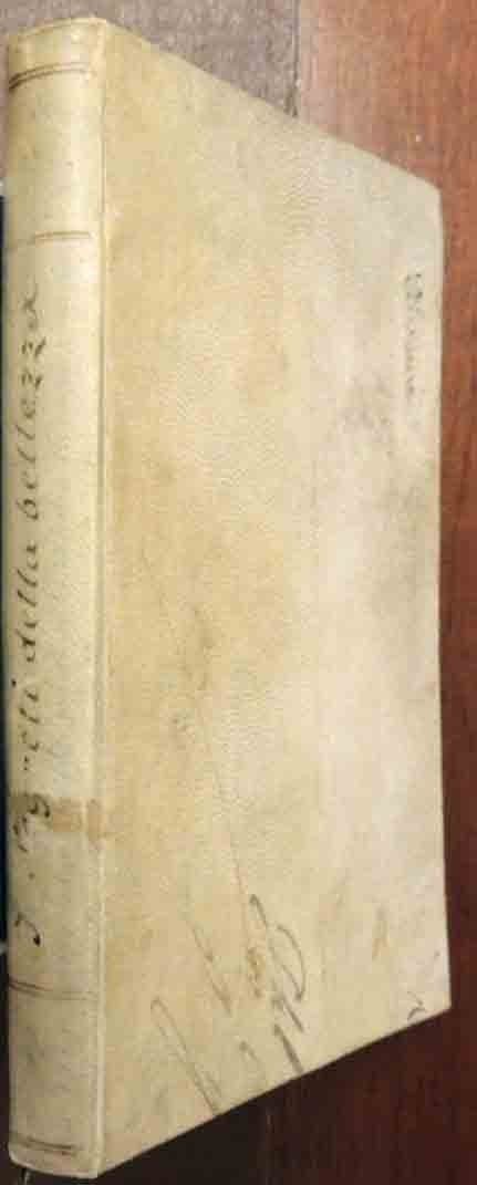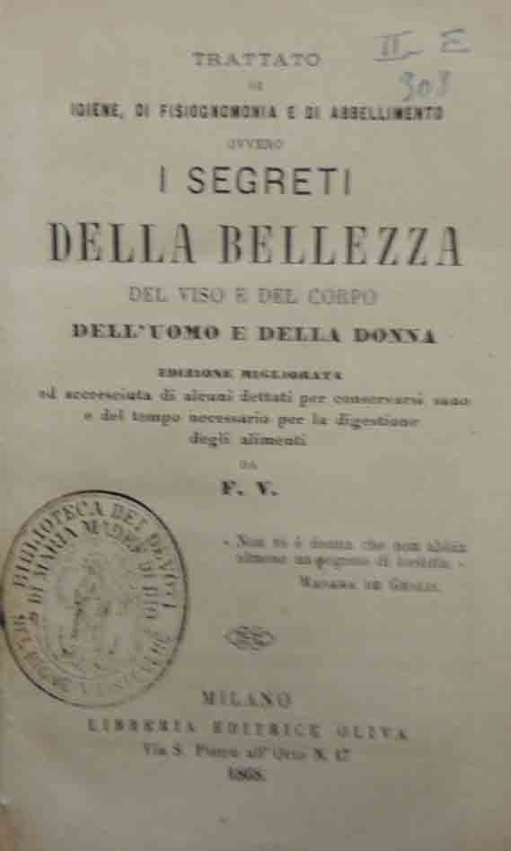 Trattato di igiene, di fisiognomonia e di abbellimento ovvero I segreti della bellezza del viso e del corpo dell’uomo e della donna, edizione migliorata ed accresciuta di alcuni dettati per conservarsi sano e del tempo necessario per la digestione degli alimenti da F. V., Libreria Editrice Oliva, Milano 1868, pp. 255, cm 16, legatura in tutta pergamenta con titoli calligrafati al dorso e segnalibro in tessuto. Al verso del piatto anteriore: applicato piccolo ex libris in carta calligrafato. Al frontespizio, numero progressivo di classificazione e timbro di biblioteca estinta (Biblioteca dei devoti di Maria Madre di Dio nel Rione Trastevere). Leggere tracce d’uso, sgualciture, minime fioriture,una piccola mancanza al margine dell’indice, ma nel complesso buona copia solidamente legata.