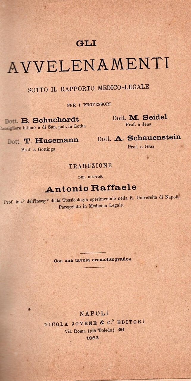 TRATTATO DI MEDICINA LEGALE opera completa in 4 VOLUMI di G. Maschka. Napoli, Jovene Editori, 1889 1893. XI, 1177 + 879 + 795 + 811 pagine. 19 incisioni nel testo e 2 tavole cromolitografiche. Copertine coeve in mezza pelle. Stato di conservazione: buono (pagine ingiallite, fioriture, gallerie marginali di tarlo estinto, sporadiche sottolineature a matita leggera) Libro usato saggistica
