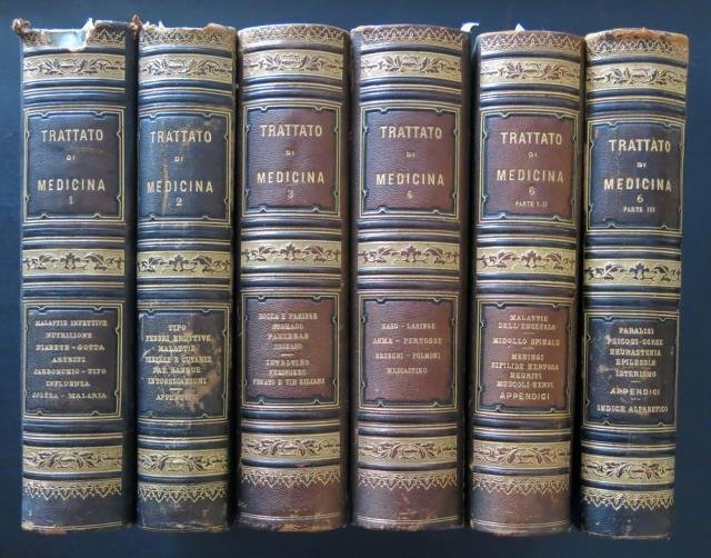 Unione Tipografico Editrice, Torino, 1892 - 1897. Traduzione italiana riveduta dal Dr. B. Silva. Arricchita di Aggiunte e Annotazioni originali (dettate da distinti clinici e patologi). Gli altri Autori collaboratori: Babinski, Ballet, Brault, Chantemesse, Charrin, Chauffard, Gilbert, Guinon, Le Gendre, Marfan, Marie, Mathieu, Netter, Oettinger, Andrea Petit, Richardière, Roger, Ruault, Thibierge, Ferdinando Widal. Prima originale edizione italiana. Sei volumi in 4to (su sette, manca il quinto). Volume Primo (Parte Prima e Parte Seconda): Parte Prima: “Patologia generale delle infezioni. Disturbi e malattie della nutrizione”, pp. 495. Parte Seconda: “Malattie infettive comuni all'uomo ed agli animali - Febbre tifoidea - Malattie infettive”. 1892 - 1893, pp. XVI (Indice), 570 (con Indice delle figure) + (7) (Ricettario) stampato su carta fine verdina; Volume Secondo: “Tifo esantematico – Febbri eruttive – Malattie Veneree e cutanee – Patologia del sangue – Intossicazioni”. Con Appendice originale italiana con Tavola colorata. 1893, pp. 809 (con indice delle Figure) + (1) + IX – XXVII (Ricettario) stampato su carta fine verdina, e con 1 tavola in colore in cromolitografia a doppia pagina di funghi; Volume Terzo: “Malattie della bocca e della faringe – Malattie dello stomaco – Malattie del pancreas”. Con Appendice originale italiana Sulle malattie dell'Esofago. 1894, pp. XIV + 1 (Indice d elle figure), 552 (con Indice delle Figure) + XXIX – L (Ricettario) stampato su carta fine verdina; Volume Quarto (Parte prima e Parte Seconda): Parte Prima: “Malattie del naso e della laringe – Asma – Pertosse”, 1894, XXXII (Indici e “Charcort e la Scuola della Salpetriere”), 520; Parte Seconda: “Malattie croniche del polmone e del mediastino – Malattie acute del polmone – Malattie della Pleura”. Con Appendice originale italiana sulle Malattie del sistema respiratorio in rapporto colla gravidanza, 1895, pp. 558 + (1) + LIII - LXXXIV(Ricettario) stampato su carta fine verdina; Volume Sesto (Parte Prima e Parte Seconda). Parte Prima: “Malattie dell'encefalo – Malattie della protuberanza anulare e dei peduncoli cerebrali – Malattie intrinseche ed estrinseche del midollo spinale”, 1896, pp. XV (Indice) 519. Parte Seconda: “Malattie delle meningi – Sifilide dei centri nervosi - Neuriti – Malattie dei muscoli e dei nervi in particolare – Miopatia primitiva progressiva – Distrofie di origine nervosa”. 1896, pp. XV (Indice), 537; Volume Sesto (Parte Terza): “Paralisi generale progressiva – Le psicosi – Coree – Paralisi agitante – Malattia di Thomsen – Neurastenia – Epilessia, Isterismo”, 1897, pp. 121 (con Indice alfabetico) + 2 (Editoriali). Tutti i volumi sono rilegati in percallina con dorsi in pelle con ricchi fregi e titoli in oro, fogli di guardia in carta decorata o in blu scuro, punte in pelle. Opera enciclopedica di capitale importanza in campo medico, redatta da eccelsi luminari di allora, nomi ancora oggi di studio e riferimento. Alcune ovvie imperfezioni delle legature, volumi eleganti e in buono stato di conservazione.