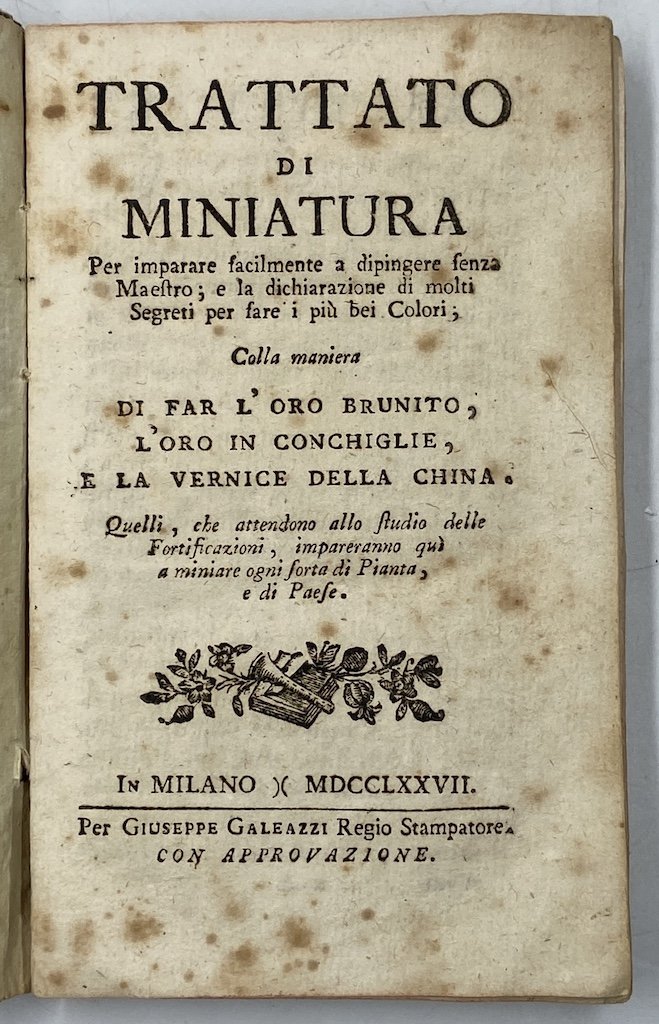 TRATTATO DI MINIATURA Per imparare facilmente a dipingere senza Maestro; e la dichiarazione di molti Segreti per fare i più bei Colori, Colla maniera DI FAR L’ORO BRUNITO, L’ORO IN CONCHIGLIE, E LA VERNICE DELLA CHINA. Quelli, che attendono allo studio delle Fortificazioni, impareranno qui a minare ogni sorta di Pianta, e di Paese. IN MILANO MDCCLXXVII. Pre GIUSEPPE GALEZZI Regio Stampatore. [1777]