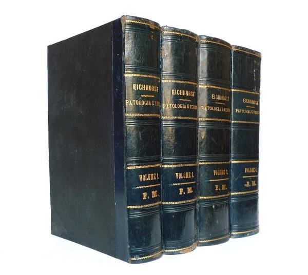 Traduzione del Dottor Alessandro Clerici. Seconda edizione italiana sulla quinta edizione tedesca, riveduta da Augusto Murri. Volume Primo: Malattie dell'apparato circolatorio - Malattie dell'apparato respiratorio - Con 135 figure intercalate. 747 pagine. Volume Secondo: Malattie dell'apparato digerente, dell'apparato uropoietico e dell'apparato sessuale - Con 138 figure intercalate. 912 pagine. Volume Terzo: Malattie dei nervi, dei muscoli e della pelle - Con 257 figure intercalate. 987 pagine. Volume Quarto: Malattie del sangue e degli organi ematopoietici - Malattie del ricambio materiale e malattie da infezione - Con 112 figure intercalate. 1051 pagine, compreso l'Indice Alfabetico - Analitico dell'opera completa. Quattro volumi rilegati in mezza pelle in condizioni che vanno dal buono al mediocre. Ordinarie tracce d'uso e del tempo. Sporadiche fioriture, specie nel secondo volume. Timbri di appartenenza e della libreria, raramente qualche scritta a matita. Nel complesso l'opera si presenta in condizioni accettabili. Worldwide delivery.