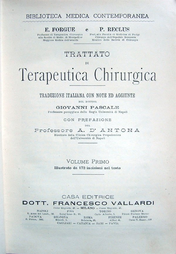 Trattato di terapeutica chirurgica. Traduzione italiana con note ed aggiunte del dott. Giovanni Pascale, Professore pareggiato della Regia Università di Napoli. Con prefazione del Professore A. D'Antona. Volume primo. Illustrato da 172 incisioni