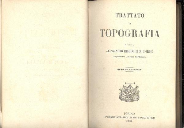 IN 8°, pp.XV + 448, CON 231 fig.NEL TESTO + 1 CARTA + v.r.DELL' ITINERARIO DA<BR>PINEROLO A CESANNE. LEGATURA D'EPOCA RIGIDA, DORSO IN PELLE CON TITOLO E FREGI IN ORO. E' LA QUARTA EDIZIONE DEL TRATTATO DI TOPOGRAFIA DEL BARONE ALESSANDRO<BR>RIGHINI DI S. GIORGIO. OTTIMA CONSERVAZIONE.ID 1213