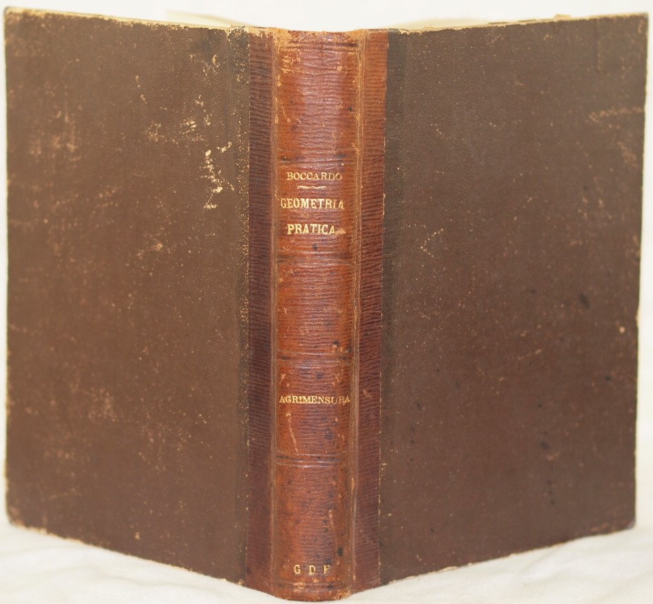 In 4. Dim. 27x20 cm. Pp. (6)+428+(4). Edizione del 1887 di questo trattato elementare di geometria pratica scritto da Ernesto Boccardo. L'opera era composta da due tomi, siamo purtroppo in possesso solo del primo tomo sull'agrimensura. All'interno: Della terra, Linee immaginarie, Rappresentazione geometrica di porzioni elementari di superficie terrestre, Rilevamento planimetrico, Planimetria strumenti e loro uso (lunghezze del terreno, squadri agrimensori, Bussola, grafometro, squadro graduato, tavoletta pretoriana, riduzione dei piani, Materiale e strumenti da disegnatore, misurazione, Applicazioni di planimetria, Livellazione ecc. Risultano purtroppo mancanti 40 pagine finali e 37 planches. In buone condizioni. Copertina in mezza pelle con titolo in oro al dorso in buone condizioni generali con lievi usure ai margini e dorso (vedere foto). Legatura in buone condizioni. All'interno le pagine si presentano in buone condizioni con fioriture. Edition of 1887 of this elementary treaty of practical geometry written by Ernesto Boccardo.<BR>The work was made up of two tomes, unfortunately we only have the first tome about agriculture. Inside: About earth, Imaginary lines, geometrical representation of portions of earth, Plane releving, Planimetry and its usage etc. Unfortunatele 40 final pages and 37 planches are missing. In good conditions. Half leather cover with golden title in the spine in good general conditions slightly worn in the edges and spine. Binding in good conditions. Inside pages are in good conditions with foxings.