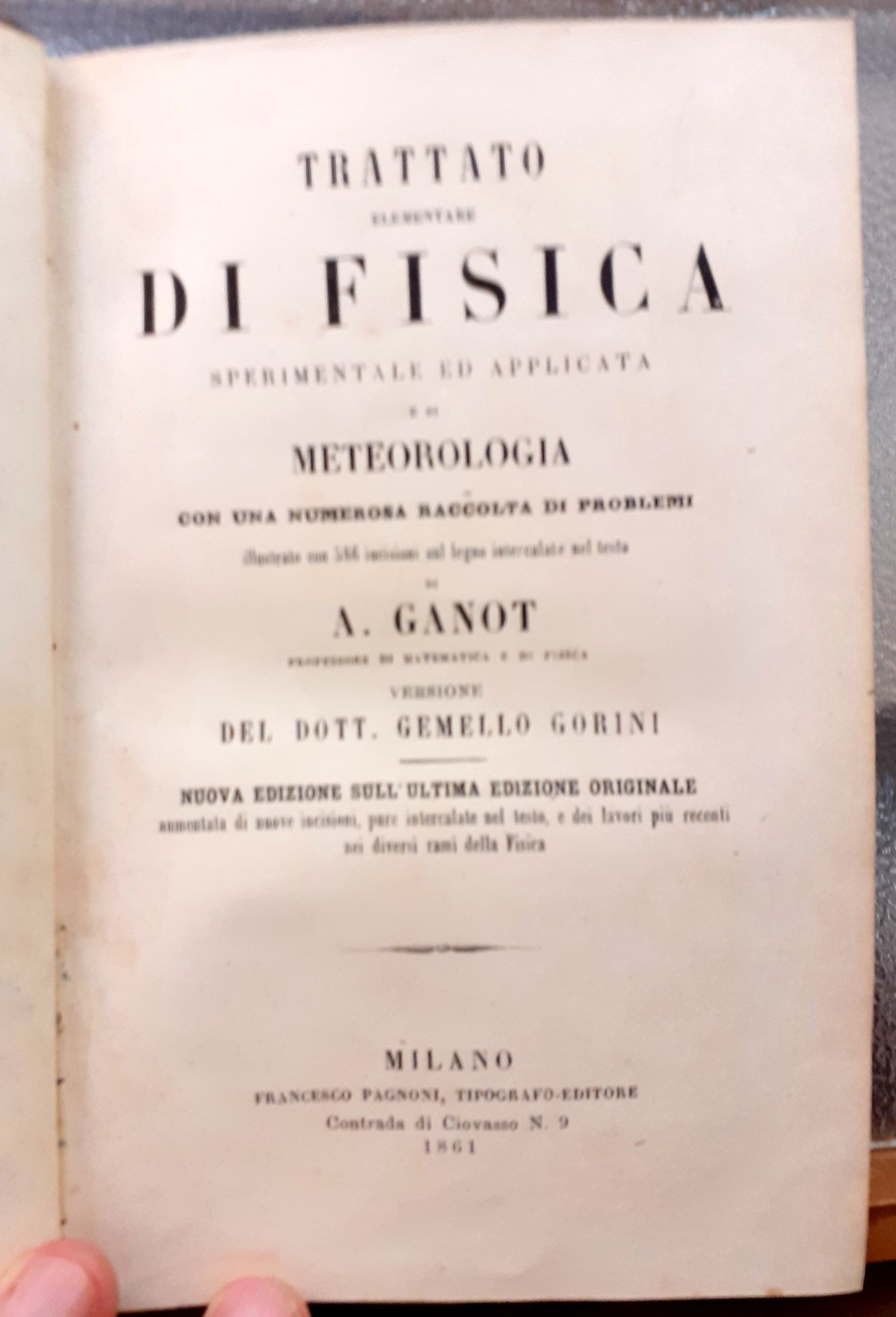 TRATTATO ELEMENTARE DI FISICA SPERIMENTALE ED APPLICATA E DI METEOROLOGIA CON UNA NUMEROSA RACCOLTA DI PROBLEMI.