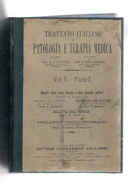 Trattato italiano di patologia e terapia medica vol. V° parte prima: malattie della cavità boccale e delle glandole salivari; malattie dell'esofago; malattie dello stomanco.