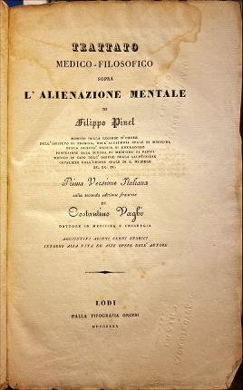 Prima versione italianasulla seconda edizione francese di Costantino Vaghi dottore in medicina e chirurgia. In 8° (cm 22,4 x 15), pp. 365. Leg. posteriore in piena tela bordeaux, tit. oro al dorso. Bross. originale conservata. Segni, strappetti e piccole mancanze ai margini della brossura e delle pagine. Tagli lievemente bruniti. Aloni d'umidità . Gore. Tracce di polvere. Due tavole incise all'acquaforte raffiguranti crani umani. L'autore è considerato un innovatore della psichiatria per la nuova concezione che egli introdusse nei riguardi del malato mentale separandolo da altre figure di emarginati sociali con i quali veniva comunemente associato. Grazie alla sua preparazione multidisciplinare introdusse per primo l'analisi fisiologica della malattia mentale facendola emergere dal clima di mistero e superstizione che sino ad allora l'avvolgeva. Fu eletto membro della Académie des sciences nel 1803. L'Impero napoleonico accordò a Pinel grandi onori che la Restaurazione successivamente gli ritirò. Le sue idee riprese dallo psichiatra Jean-Étienne Dominique Esquirol (1772–1840) ispirarono il regolamento psichiatrico del 1838 che rimase in vigore sino al 1990. Buone condizioni.