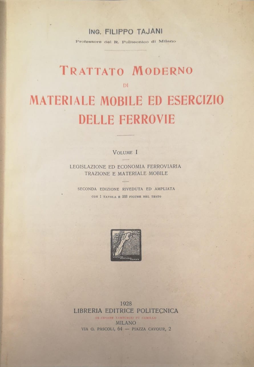 In-8 p., 2 volumi, mezza pelle moderna con angoli (abras. ai dorsi), cofanetto in mezza tela, pp. XIV,510; XII,387; con complessive 726 figg. nel testo e 9 tavole fuori testo, più volte ripieg. Il 1° vol. è in seconda edizione, riveduta ed ampliata. Vi sono contenuti: Legislazione ed economia ferroviaria, trazione e materiale mobile - Esercizio tecnico, impianto delle stazioni. Il 1° vol. è mancante dell'occhietto, di una metà della tav. fuori testo e 2 cc. sono state restaurate per manc. al margine esterno e all'ang. sup.; altrimenti buon esemplare.