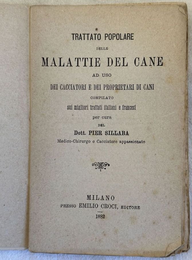 Interessante volume del 1882, un trattato popolare delle malattie del cane ad uso dei cacciatori e proprietari scritto da Pier Sillaba. All'interno: Medicamenti per uso esterno, Medicamenti per uso interno, Patologia medica, Patologia chirurgica e medicina operatoria, Parte ostetrica ecc. In buone condizioni. Copertina editoriale in buone condizioni generali con lievi usure ai margini e dorso. Legatura in buone condizioni. Pagine in buone condizioni con rare fioriture. In 16. Dim. 16x10,5 cm. Pp. 143+(1). Interesting volume of 1882, a popular treaty of deseases of dgos for the usage of hunters and owners written by Pier Sillaba. Inside: medicine for external and internal usage, medical pathology, Surgical pathology and surgical medicine, obstetrics ecc. In good conditions. Editorial cover in good general conditions lightly worn in the extremities. Binding in good conditions. Inside pages are in good conditions with occasional foxing. In 16. Dim. 16x10,5 cm. Pp. 143+(1).