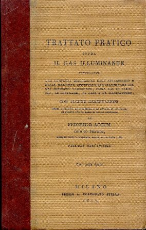 In-8°, pp. 215, legatura editoriale m. pelle con piatti telati con titolo a stampa. 8 tavv. in tinta seppia ripiegate f.t. Perfetto stato. Ristampa anastatica della rara prima edizione italiana (Milano, Stella, 1817) del celebre trattato sull'illuminazione a gas dell'Accum (Bückeburg, Schaumburg-Lippe, 1769-Berlino, 1838), uno dei maggiori chimici del secolo decimonono. L'Accum collaborò con Rudolph Ackermann 'in order to introduce into England the lighting of towns by gas; and in 1810, when the London Chartered Gaslight and Coke Company was formed, Accum was nominated one of its engineers. It is said that the prompt adoption of this mode of lighting in London and other large cities was greatly due to his 'Practical Treatise on Gas Light' (DNB). Cfr. (per l'edizione originale inglese): Partington, III, 827. Bolton, I, 261.