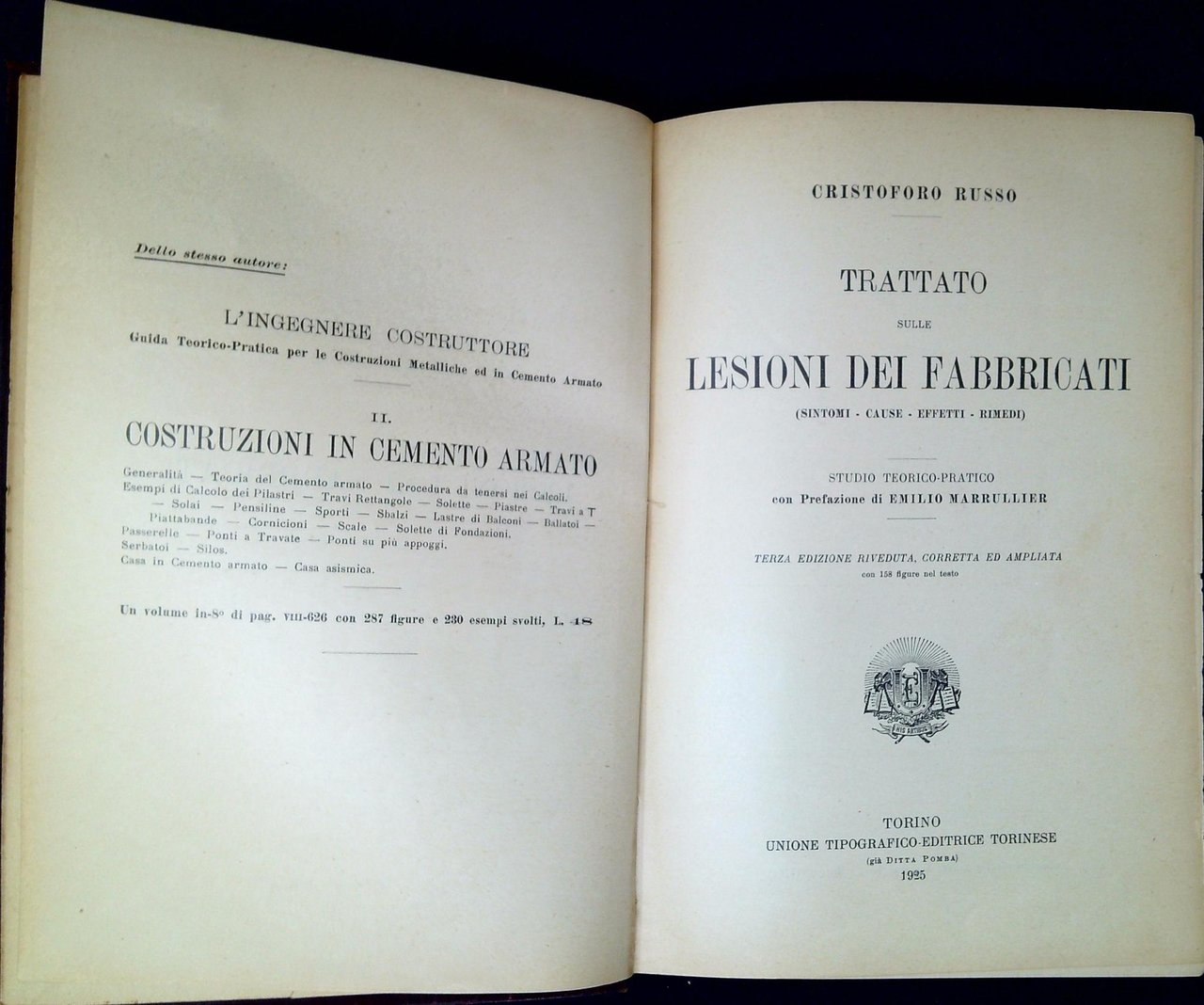 Cristoforo Russo ; con pref. di Emilio Marrullier Trattato sulle lesioni dei fabbricati : sintomi, cause, effetti, rimedi : studio teorico-pratico. Torino, Unione tipografico-editrice torinese 1925, 338 p. : ill. ; 25 cm. (47148)