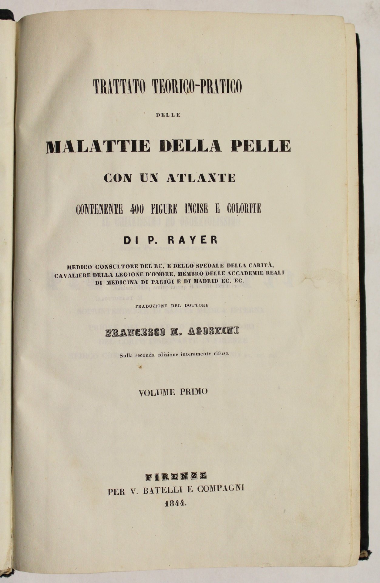 3 voll. in 8° (mm 240x150). Pag. 344, 356, 344. Atlante non presente. Tela verde editoriale, titoli su tasselli in pelle verde al dorso. Medico francese, Pierre François Olive Rayer (1793 -1867) consulente del re Luigi Filippo, cofondatore della Società di Biologia e membro dell'accademia delle scienze, ha dato un grande contributo all'arte medica in campo di anatomia patologica, fisiologia e parassitologia. Ricordiamo i noduli e la malattia di Rayer in memoria dello scienziato. Discreto esemplare internamente, piccole mende alla tela delle legature. Garrison-Morton (3989).