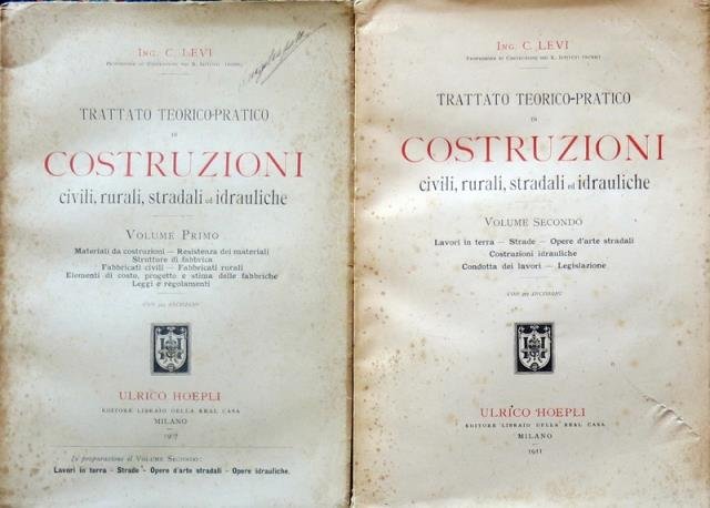Trattato teorico pratico di costruzioni civili, rurali, stradali ed idrauliche. Volume Primo: Materiali da costruzioni – Resistenza dei materiali – Strutture di fabbrica – Fabbricati civili - Fabbricati rurali – Elementi di costo, progetto e stima delle fabbriche - Leggi e regolamenti. Volume Secondo: Lavori in terra – Strade – Opere d'arte stradali – Costruzioni idrauliche – Condotta dei lavori - Legislazione.