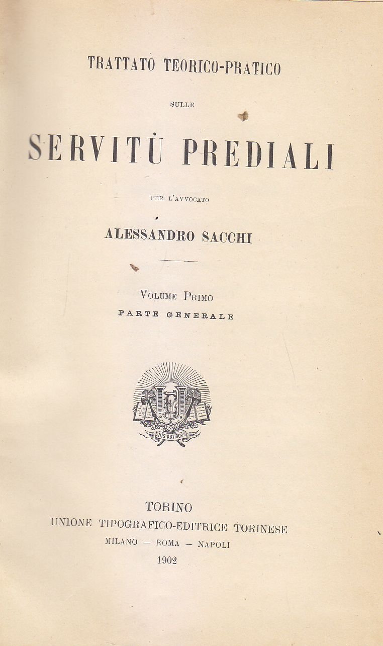 TRATTATO TEORICO PRATICO SERVITU' PREDIALI Volume I: PARTE GENERALE di Alessandro Sacchi. UTET editore, 1902.1176 Pagine.