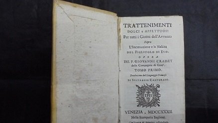 VENEZIA, BAGLIONI, 1732. Per tutti i Giorni dell`Avvento Sopra L`Incarnazione e la Nascita del Figliuolo di Dio. Opera del P. Giovanni Crasset della Compagnia di Ges˘. Traduzione dal Linguaggio Francese di Selvaggio Canturani. In 16∞: pp. 312. Con alc. capolettera e finalini n.t. Leg. t. pergamena, mancano le sguardie libere, fioriture sparse.