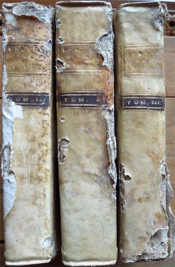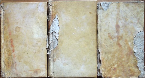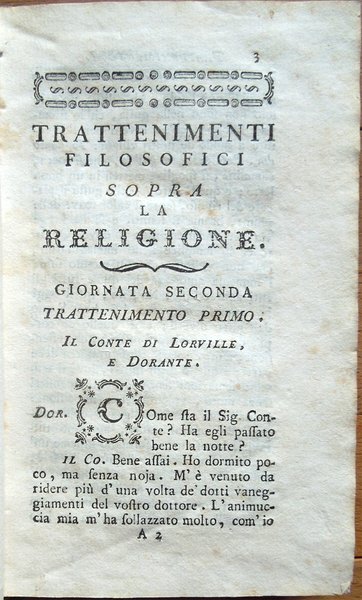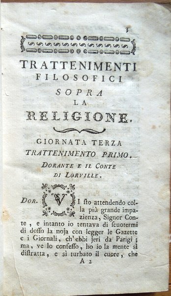 Tre tomi in-16° (16,1 x 10 cm) pp. XII, 389, (1); 442, (2); 429 (1), legatura coeva in piena pergamena con titoli su tasselli al dorso. Evidenti segni d'uso e del tempo alla legatura, che presenta mende, strappi e mancanze alla pergamena, con legatura che rimane comunque salda. Conservati i segnacoli originali. Al tomo I, piccoli lavori di tarlo nella parte inferiore delle pagine 1-55, che interessano anche il testo, con perdita di alcune lettere; da pagina 55 a pagina 167, detti lavori, più contenuti, riguardano solo la parte superiore e quella inferiore del margine interno bianco. Nel margine esterno bianco di pagina 340 del tomo II e di pagina 290 del tomo III, piccolo, vecchio restauro che non riguarda il testo. Per il resto, a parte i problemi segnalati alla legatura, esemplare fresco e ben conservato. Edizione non comune. Si tratta, con tutta probabilità (l'ICCU registra solo la presente), della prima ed unica traduzione italiana dell'opera Entretiens philosophiques sur la religion, dell'abate francese Louis Guidi, opera edita, per la prima volta, nel 1771. Di detto scritto, che rappresenta la continuazione di una pubblicazione apparsa nel 1769, dal titolo Entretiens sur la religion entre un jeune incrédule et un catholique, seppur, per stessa ammissione dell'autore, possa esser considerato da essa indipendente (cfr. Entretiens philosophiques sur la religion, Avertissement: «C'est-là que se termine une petite brochure, qui parut il y a deux ans, dont celle-ci, quoique la suite, peut être regardée comme absolument indépendante»), nel 1772 e nel 1780, venne pubblicato un seguito, in due volumi entrambi intitolati Suite des Entretiens philosophiques sur la religion. Questo l'Avvertimento al lettore: «Questi sono Trattenimenti sopra la Religione, nulla di maggiore importanza; essi sono Filosofici, qual cosa più conforme al gusto del nostro secolo? Sono Polemici, e quinci nulla vi ha, che più stuzzichi la contraddizione. Trattasi qui di un giovane Ufiziale, che Cristiano non è, né Miscredente, il qual tuttavia sente la necessità di pigliar partito. È instruito abbastanza sopra la Religione, per sospettarne la Divinità, ma troppo poco poi, perchè e' risponda a' suoi Avversarj. Sbalordito dal miracolo di San Cosmo (la relazion del quale si è sparsa in Parigi sotto il sigillo del Governo), si ritira nel suo Castello per esaminarne le conseguenze. Un Amico sotto il nome di Alcimo, Cristiano instruito insieme e zelante, sviluppa a lui quelle conseguenze, risponde alle difficoltà sue, e fa impressione. Qui termina un picciolo scritto venuto alla luce due anni sono, del quale il presente, comeché siane la continuazione, può tuttavia essere riputato come del tutto indipendente. Conciossiacosachè, un novello Attore qui comparisce, e fa mutare scena rappresentando dei nuovi oggetti. Incredulo costui de' più fermi, comeché sincero in apparenza, cioè il Conte di L. vicino del nostro Soldato si reca da lui a trattar la causa della Irreligione. I Signori Filosofi non avran motivo di dolersi di cotesto loro Avvocato: perocché queste appunto sono le idee loro, il loro sistema, e gli artifìzj, a' quali e' dà mano, e ch'egli fa valere. E siccome le bestemmie e le ingiurie non sono ragioni, non avranno essi a male, che si risparmino a' leggitori, e in levandole via, si rendano così le obbiezioni loro più forti, e meno muovano a sdegno le loro asserzioni. Che se non accusan eglino di debolezza colui, che gli rappresenta, non ne taccieranno forse la Parte loro avversaria; e i Cristiani medesimi non si dorranno per avventura dell'insuffìcienza di essa? Non v'ha dubbio, ma questo può accadere agli uni per animosità contro del Cristianesimo, ed agli altri per l'alta idea, ch'essì ne hanno. Se i primi mostrat'han del disprezzo pe' Cartesj, pe' Malebranchj, pe' Newtonj, pe' Clarche, per gli Abbadie, pe' Pascal, pe' Bossuet, Outteville, ed altri, come mai Alcimo, che è inferiore a questi grand'uomini, potrà comparire, che e' ragioni con forza e precisione a Scrittori, da' quali, quando ei voglia porsi a combatterli, verrà da Fanatico trattato, o da sciocco? Quanto a que' Cristiani, che si dorranno di veder la causa loro debolmente difesa, purtroppo ne sente Alcimo l'eccellenza, e non può non gemere con essoloro sopra quella avventurata impotenza di porre giammai l'apologia della Religione sullo stesso grado della sua dignità. Che se la lingua stessa degli Angioli sarebbe senz'energia favellando della Divinità, come mai l'eloquenza umana, avendo a ragionar della Religione, che è il lavoro più eccellente di Lei, potrebbe non balbettare del continuo? Alcimo per tanto di questa verità ben convinto non altramente, che que' Cristiani, che sono illuminati, gli priega a considerare, che questi Dialoghi fatti sono per Dorante, cioè per un giovane Ufiziale, il quale stato essendo nel Collegio de' principj del Cristianesimo nutrito, disgustato poscia entrando nel mondo delle massime di esso, solleticato da' piaceri, rattenuto da' rimordimenti, cammina con dubbio passo fra la Religione, che lo spaventa, e la incredulità, che lo invita. Quanta gioventù, e forse d'ambi i sessi, la qual trovasi in questa penosa situazione, e desidera come Dorante un lume, che le faccia conoscere il diritto e sicuro sentiero? Leggano ora sì fatte persone questi dialoghi senza timore delle spine di una Metafisica troppo raffinata. La noja del sillogismo appartiene ad una tesi, l'aridità della dialettica conviene alla controversia: ma in una conversazione si richiede un tuono di libertà. In una disputa onesta e libera, l'immaginazione varia i suoi giuochi, ed esce anco di strada facendo digressioni, le quali pur troppo sono buone, quando contribuiscono allo sviluppamento di rilevanti verità. Avvegnaché dal bollore della disputa esce spesse fiate quel lume, che vale ad illuminarci. L'errore è quel solo, che si maschera, e ci seduce. La verità sola, qualche volta lascia nell'intimo dell'animo un