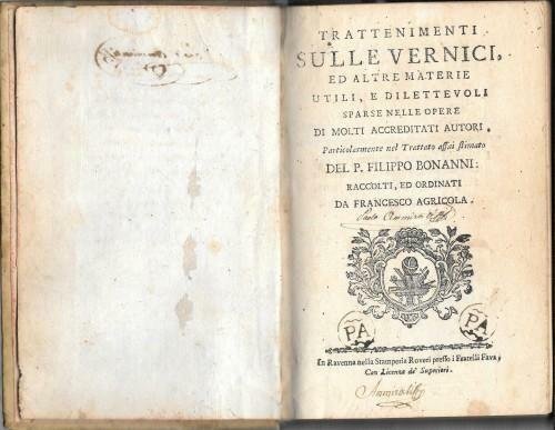 Trattenimenti sulle vernici, ed altre materie utili, e dilettevoli sparse nelle opere di molti accreditati autori. Particolarmente nel Trattato assai stimato del P. Filippo Bonanni: raccolti, ed ordinati.