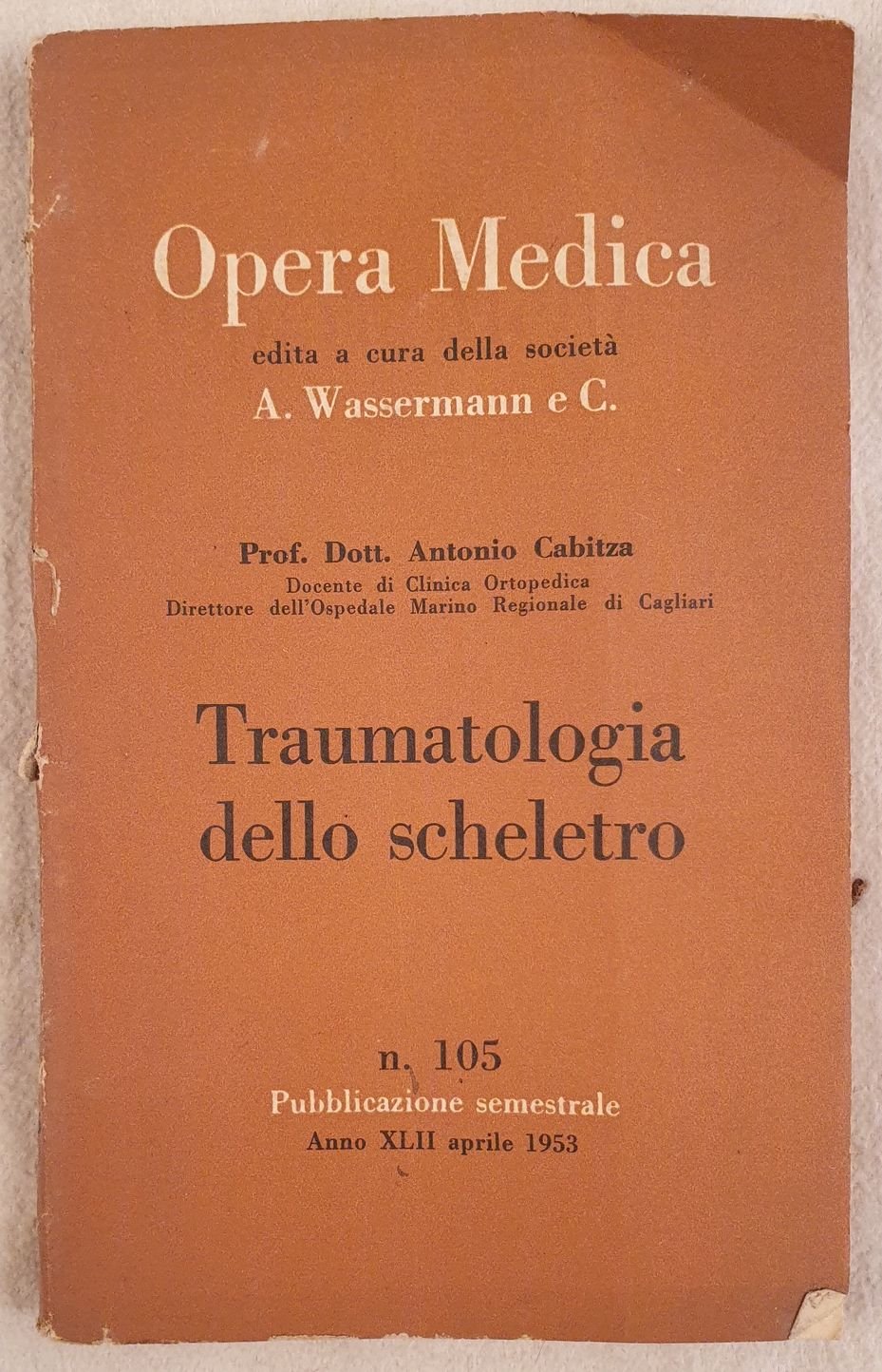 Edizione del 1953 della serie "Opera Medica A. Wassermann e C."n. 105 di questo volume sulla traumatologia dellos cheletro scritto da Antonio Cabitza. Tra gli argomenti trattati: Distorsioni, trasporto dell'infortunato, terapia delle fratture, fratture esposte, contusionie ferite articolari, contenzione delle fatture, anestesia in traumatologia, cure coadiuvanti nel trattamento delle fatture cure, esiti e recupero ecc. In buone condizioni. Copertina editoriale in discrete condizioni generali con usure e strappi ai margini e dorso. Legatura in buone condizioni. All'interno le pagine si presentano in buone condizioni con rare fioriture e qualche piegatura agli angoli. In 16. Dim. 18x11 cm. Pp. 239+(1). Edition of 1953 of the series "Opera Medica A. Wassermann e C."n. 106 of this volume about tramautlogy of skeleton written by Antonio Cabitza.<BR>In good conditions. Editorial cover in fair general conditions with wearings and tears in the edges and spine. Binding in good conditions. Inside pages are in good conditions with occasional foxings and some foldings in the corners. In 16. Dim. 18x11 cm. Pp. 239+(1). <BR><BR>