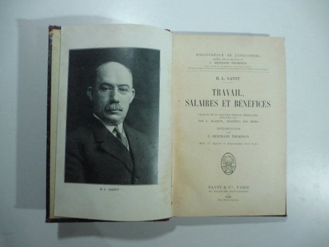 In 8, cm. 14 x 22, pp. 214 + (10), con un ritratto in bianco e nero dell'autore all'antiporta e 17 figure e diagrammi piu' volte ripiegati, fuori testo. Legatura in mezza pelle con titoli oro al dorso. Pagine ingiallite dal tempo. Collana "Bibliothe'que de l'Industriel". Introduzione di C. Bertrand Thompson, traduzione dalla seconda edizione americana (New York 1916) di A. Blandin. Questa opera rientra nell'ultima parte della carriera del noto ingegnere meccanico statunitense, noto principalmente per aver ideato nel 1910 il Diagramma di Grantt, strumento grafico per la rappresentazione sull'asse temporale delle attivita' che concorrono al completamento di un progetto, permettendone cosi' la programmazione ed il controllo dell'avanzamento. Oltre allo sviluppo del diagramma che porta il suo nome, si occupo' anche di sistemi di incentivazione nell'ambito delle retribuzioni, e sviluppo' alcuni metodi per la misurazione dell'efficienza e della produttivita' dei lavoratori. Testo in francese. Ottimo esemplare.