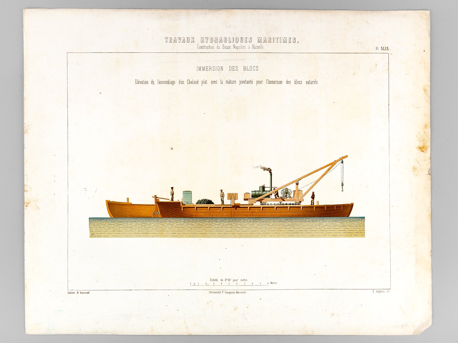 Travaux Hydrauliques Maritimes. Construction du Bassin Napoléon à Marseille. Chromolithographie : Planche XLIX : Immersion des Blocs. Elévation de l'assemblage d'un Chaland plat avec la mâture pivotante pour l'Immersion des blocs naturels ; 1 chromolithographie format 53 x 42 cm, Chromolith. F. Canquoin, Marseille, 1861 Edition originale. Etat satisfaisant (lég. sali, essentiellement en marge, méritant néanmoins encadrement).