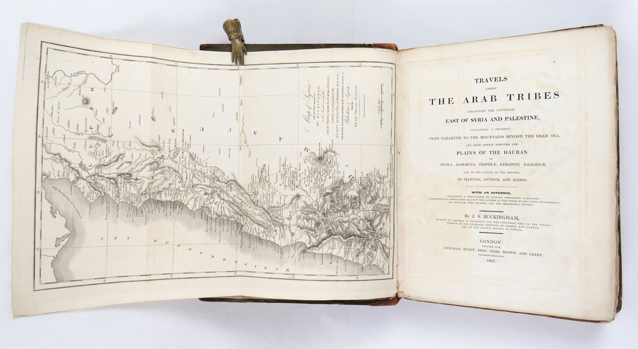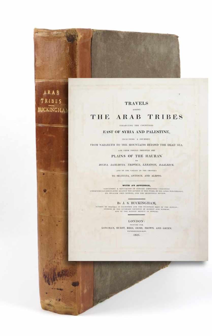 LIBROPrima edizione.Ottimo esemplare a pieni margini in barbe, proveniente dalla prestigiosa collezione di Henry Blackmer (ex libris); ultimi fascicoli, dal «Postscript» in poi, in parte slegati; catalogo dell’editore, un sedicesimo sottomisura, legato dopo il foglio di guardia posteriore.Secondo libro dedicato da Buckingham al Medio Oriente, impreziosito dal formato grande e dalle belle illustrazioni a corredo del testo. Viaggiatore e scrittore, l’inglese James Silk Buckingham fu fondatore e direttore della rivista «Calcutta Journal», oltre che autore di diversi libri di viaggio, come il qui presentato «Travels Among the Arab Tribes» pubblicato nel 1825.