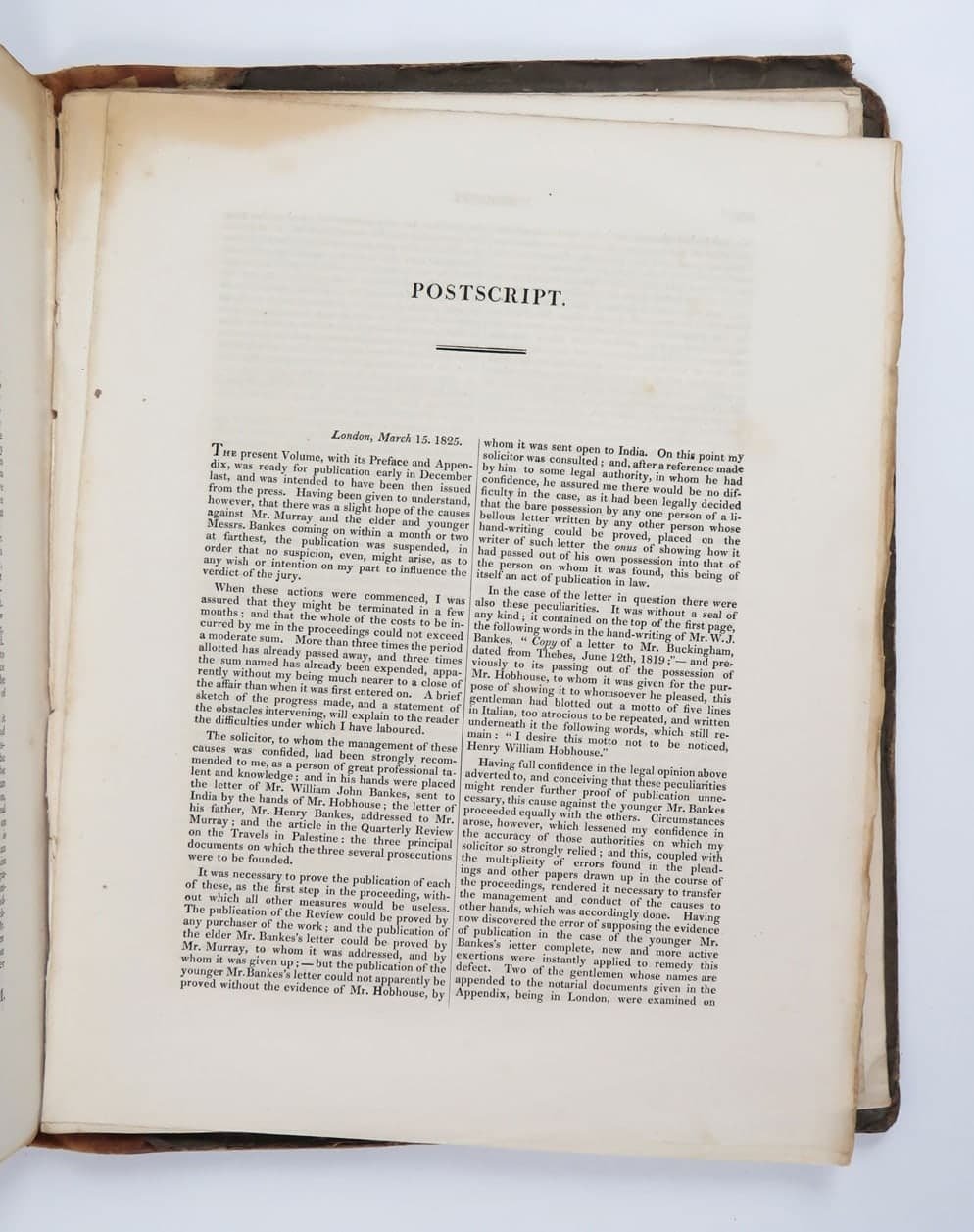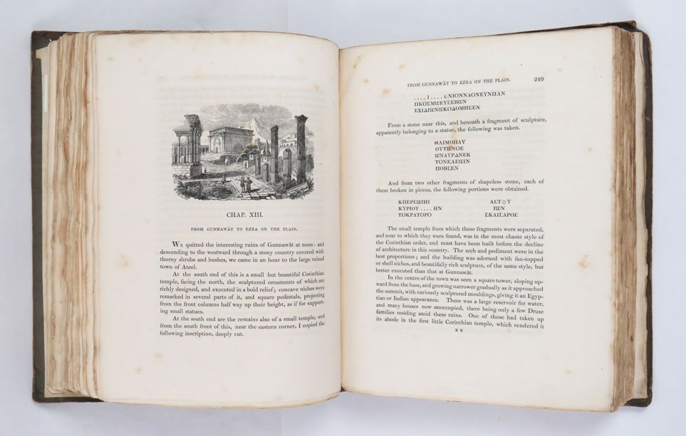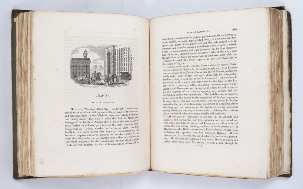 - pp. xv [1] 679 [1] viii (Index to Travels in Palestine); grande carta della Siria e Palestina ripiegata fuori testo in antiporta; bifolio di «Postscript» fuori testo tra pp. 668-669, prima dell’indice, numerate 665*-668*; ventotto grandi incisioni all’inizio di ogni capitolo.Arrossamenti all’angolo superiore bianco delle ultime carte.