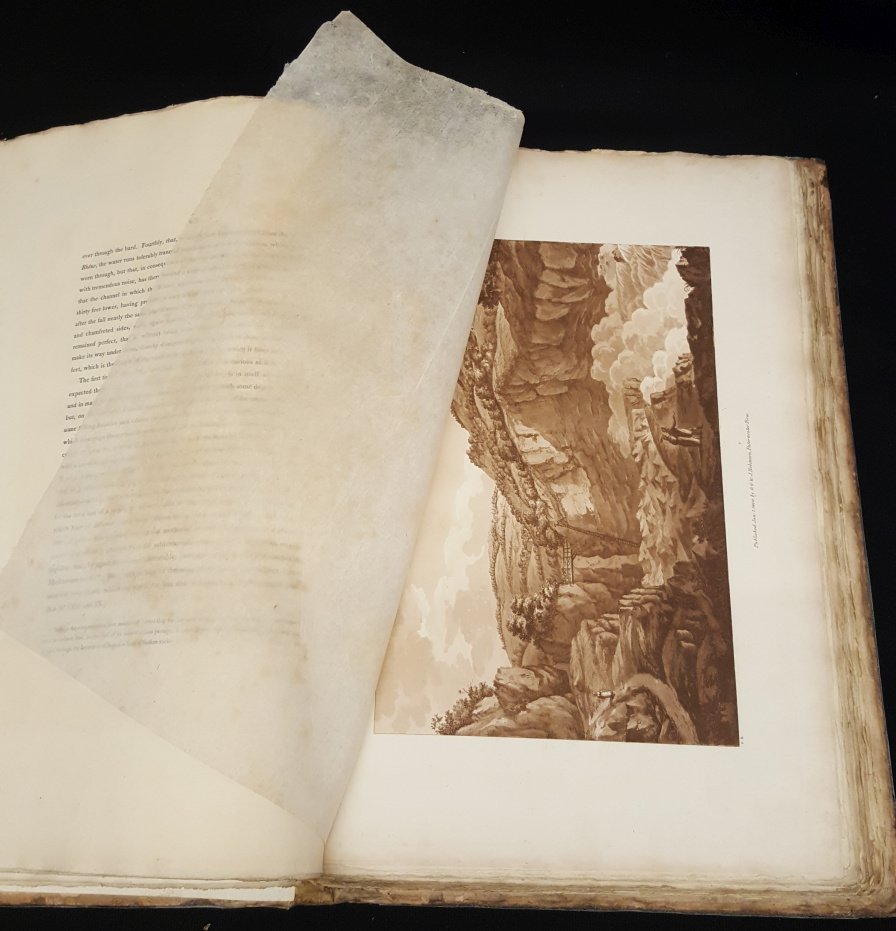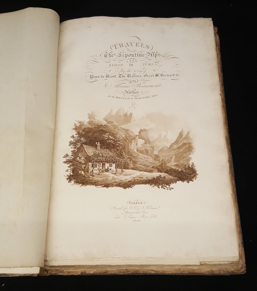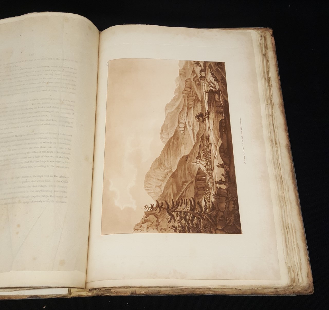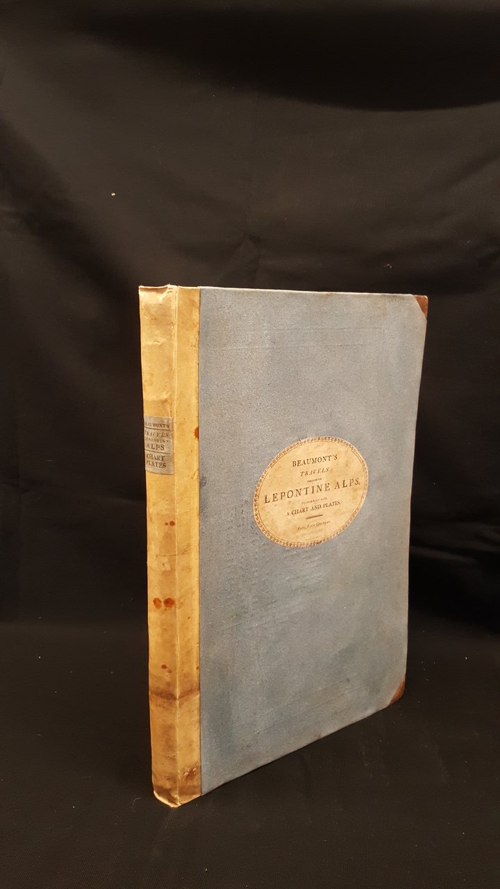 >in-folio, pp. (6), 218, legatura in mezza pergamena, piatti foderati in bella carta azzurra coeva, tasselli cartacei applicati al dorso e al piatto anteriore, angoli in pelle. Illustrato da 28 tavole fuori testo: frontespizio con bella veduta, carta topogr. ripiegata colorata a mano, pianta di Lione, 25 vedute a piena pag. impresse in bistro, il tutto inc. in rame all'acquatinta da Jean François Albanis de Beaumont. Stupende vedute di città e di paesaggi alpini (Lione, Ginevra, Cluse, Lusanne, Vevey, Sion, S. Gottardo, Martigny, S. Bernardo, etc.). Prima edizione di questa dettagliata relazione di viaggio nelle Alpi Lepontine, artisticamente illustrata. L'autore, ottimo artista di origini savoiarde (Chambery 1753-1811), fu ufficiale di Carlo Emanuele IV, e pubblicò oltre alla presente, altre tre opere analoghe, sulle alpi Cozie, Graie e Marittime. Bellissimo esemplare su carta grande (con qualche lieve fioritura nei margini). Perret 333: «Primière édition... Bel album, très rare et très recherché pour la qualité des illustrations». Pine-Coffin 800.2. Réan n. 73. ACL 27.