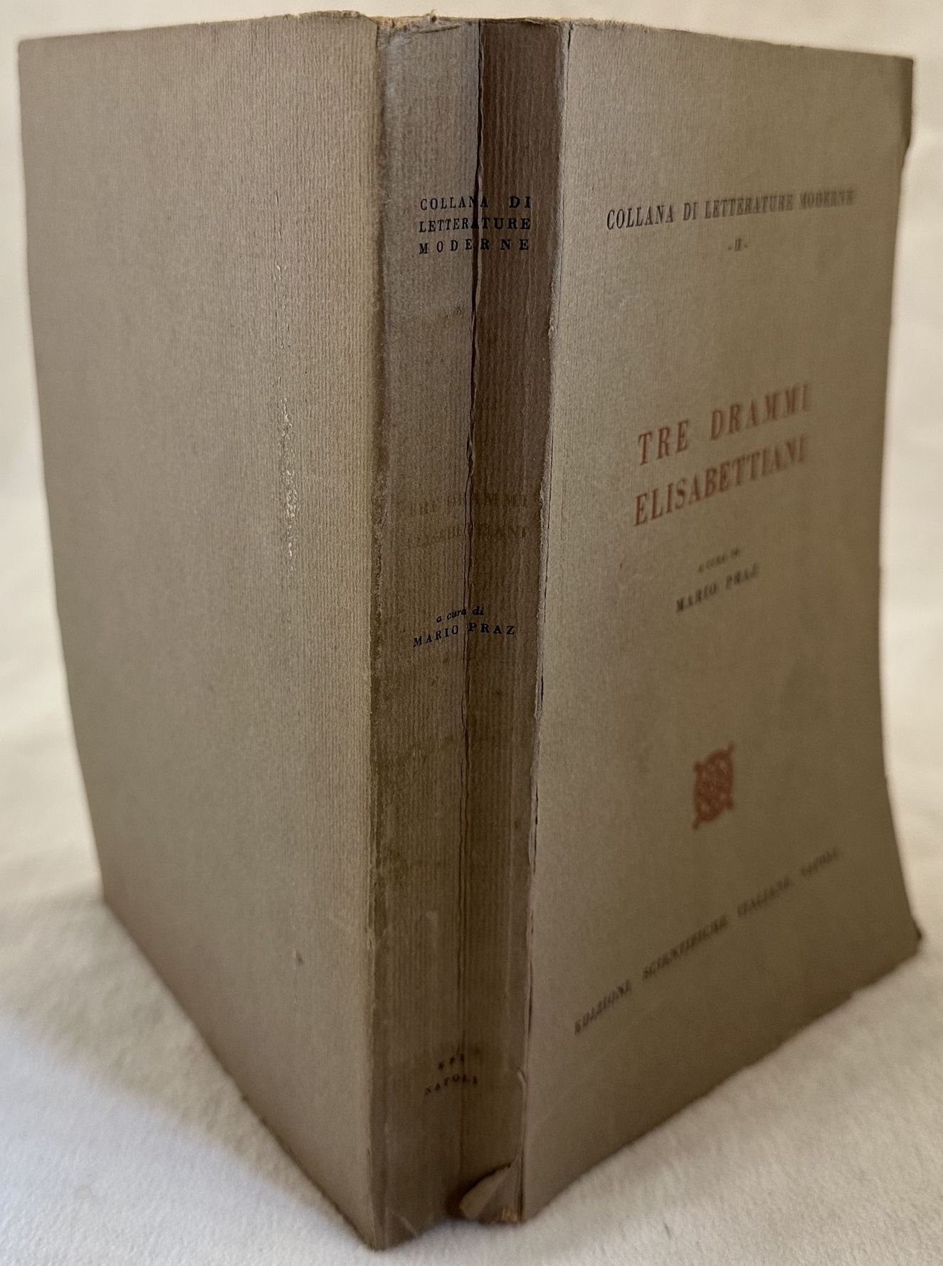 Edizione del 1958 di questo studio su tre drammi elisabettiani a cura di Mario Praz della serie "Colana di letterature moderne". All'ìinterno: Il teatro elisabettiano; La tradizione di Seneca; La leggenda di Machiavelli; Beaumont e fletcher; John Webster; John Ford ecc. Sottolineature a matita e matita colorata. Firma all'occhietto. In buone condizioni. Copertina editoriale in discrete condizioni generali con lievi usure e mancanze ai margini e dorso. Legatura in discrete condizioni con lievi rotture. All'interno le pagine si presentano in buone condizioni con rare fioriture. In 8. Dim. 22x14,5 cm. Pp. (6)+492+(6).Edition of 1958 of this study about three Elizabeth dramas written by Mario Praz of the series "Colana di letterature moderne". All'ìinterno: Il teatro elisabettiano; La tradizione di Seneca; La leggenda di Machiavelli; Beaumont e fletcher; John Webster; John Ford ecc. Underlinings with pencil and coloured pencil. In good conditions. Editorial cover in fair general conditions lightly worn in the extremities. Binding in fair conditions with light cracks. Inside pages are in good conditions with occasional foxing. In 8. Dim. 22x14,5 cm. Pp. (6)+492+(6).