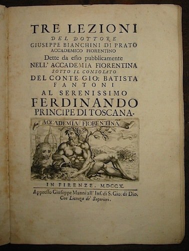 4to (cm. 25), XII-76 pp. Bella vignetta al frontis. con panorama di Firenze sullo sfondo. Capilettera e fregi n.t. Cartonato coevo con titolo ms. al ds. Ottimo esemplare in carta grave.