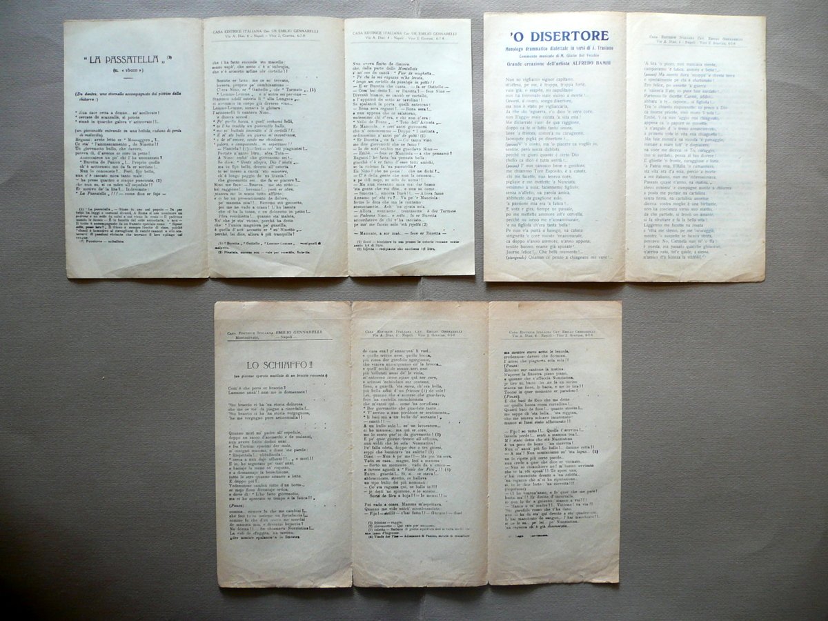Tre monologhi (pieghevoli), La passatella" Monologo drammatico di Amerigo Giuliani - creazione del celebre artista Alfredo Bambi *** "Lo schiaffo" Monologo drammatico di Amerigo Giuliani *** " 'O disertore" Monologo drammatico dialettale in versi di A. Trusiano Creazione dell'artista Alfredo Bambi Casa Editrice Italiana Emilio Gennarelli, Napoli 1917; tre monologhi teatrali in dialetto partenopeo, stampati su pieghevoli cartacei; due monologhi con una ill. fotogr. rispettivamente in b/n e virata al blu (vedi foto). Cm circa 24,5x11,5. Condizioni di conservazione Esemplari tutti ben conservati con tracce d'uso, alcune minuscole lievissime bruniture, normali minimi accenni d'ingiallimento dovuti al tipo di carta; alcuni margini con qualche minuscolo strappetto. SC03.D12878 N "