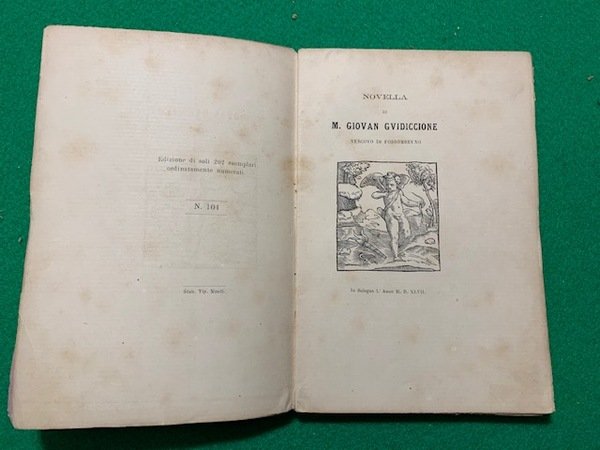 In 8°; 129, (3) pp. Brossura muta rosa coeva. Esemplare in buone-ottime condizioni di conservazione. Prima edizione in tiratura di soli 202 esemplari, questa è l'esemplare numero 104, di questa rarissima raccolta di novelle del XVI secolo. Tutte e tre le novelle sono rarissime. Al frontespizio di ogni novella una bella vignetta xilografica. Il volume contiene "La novella di M. Giovan Guidiccione, Vescovo di Fossumbruno, in Bologna, l'Anno M. D. XLVII", "Novella di M. Francesco Maria Molza, Novellamente Stampata et posta in luce, In Bologna, M. D. XLVII", "Novella di Giacomo Salvi Bolognese, Novellamente Stampata, et posta in luce, In Bologna, M. D. XLVII". Rif. Bibl.: IT\ICCU\RAV\0126538.