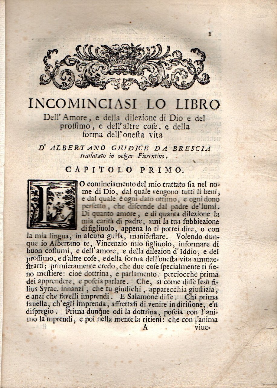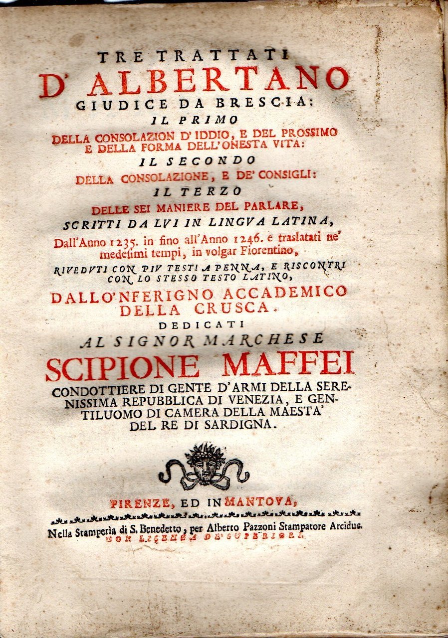 Tre Trattati d'Albertano giudice da Brescia: Il Primo, della Dilezion d'Iddio, e del prossimo e della forma dell'onesta vita: Il Secondo, della Consolazione, e dei Consigli: Il Terzo, Delle sei maniere del parlare, scritti da lui in lingua latina, dall'anno 1235 in fino all'anno 1246 e traslati ne' medesimi tempi, in volgar Fiorentino, riveduti con più testi a penna, e riscontri con lo stesso testo latino, dallo'nferigno accademico della crusca dedicati al Marchese Scipione Maffei