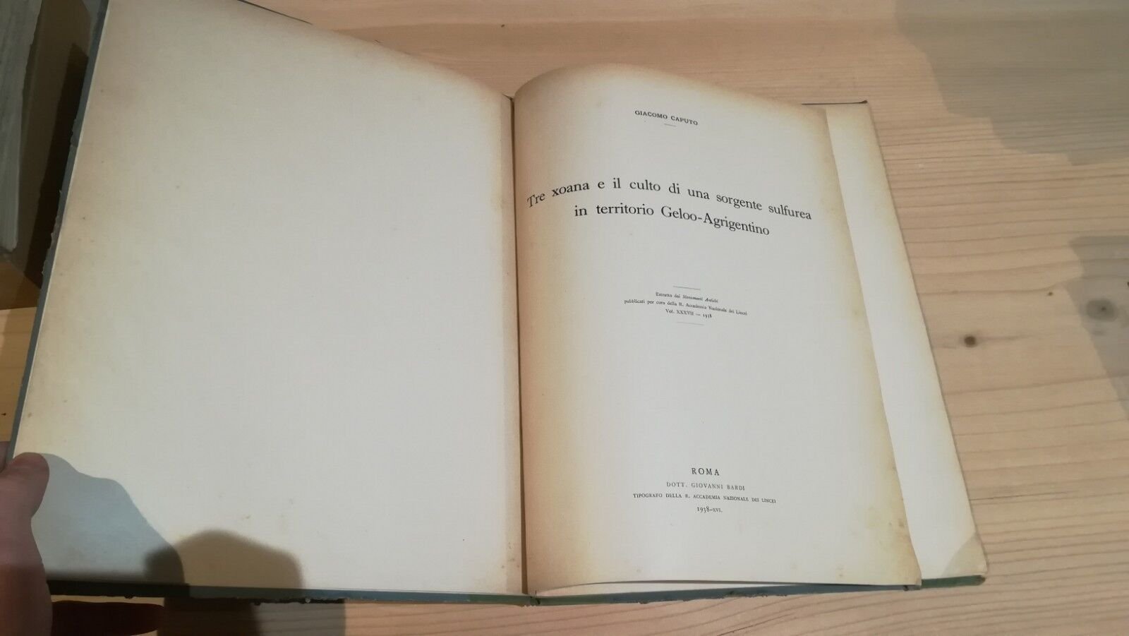 Giacomo Caputo Tre Xoana e il culto di una sorgente sulfurea in territorio geloo-agrigentino Accademia dei Lincei 1938 CON DEDICA DELL'AUTORE A GIOVANNI PUGLIESE CARRATELLI Libro in buone condizioni, minimi segni del tempo: qualche difetto, mancanza o abrasione alla rilegatura, leggere fioriture, data timbro in copertina. Non esitate a contattarci per altre foto o richieste. Saremo lieti di soddisfare ogni vostra esigenza.