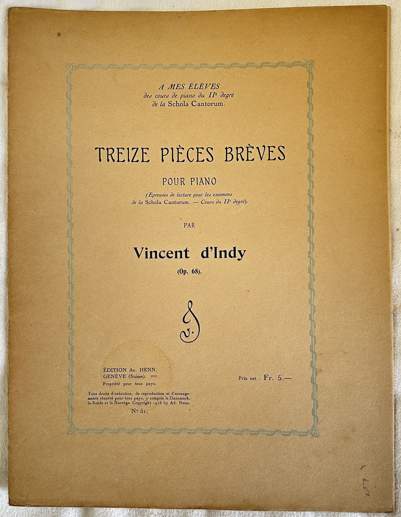 Edizione del 1916 di questo spartito per pianoforte della melodia "Treize pieces breves" dall'opera 68 del compositore francese Vincent D'Indy (1851-1931). In buone condizioni. Copertina editoriale in buone condizioni con lievi usure marginali. Lieve gora d'umidità. Legatura editorialmente assente. Pagine in buone condizioni con rare fioriture. In folio. cm. 32,5x25. Pp. 23Edition of 1916 of this melody for piano "Treize pieces breves" from the work 68 byt he french composer Vincent D'Indy (1851-1931). In good conditions. Editorial cover in good conditions lightly worn in the extremities. Binding editoriarly missing. Pages in good conditions with occasional foxing. In folio. cm. 32,5x25. Pp. 23