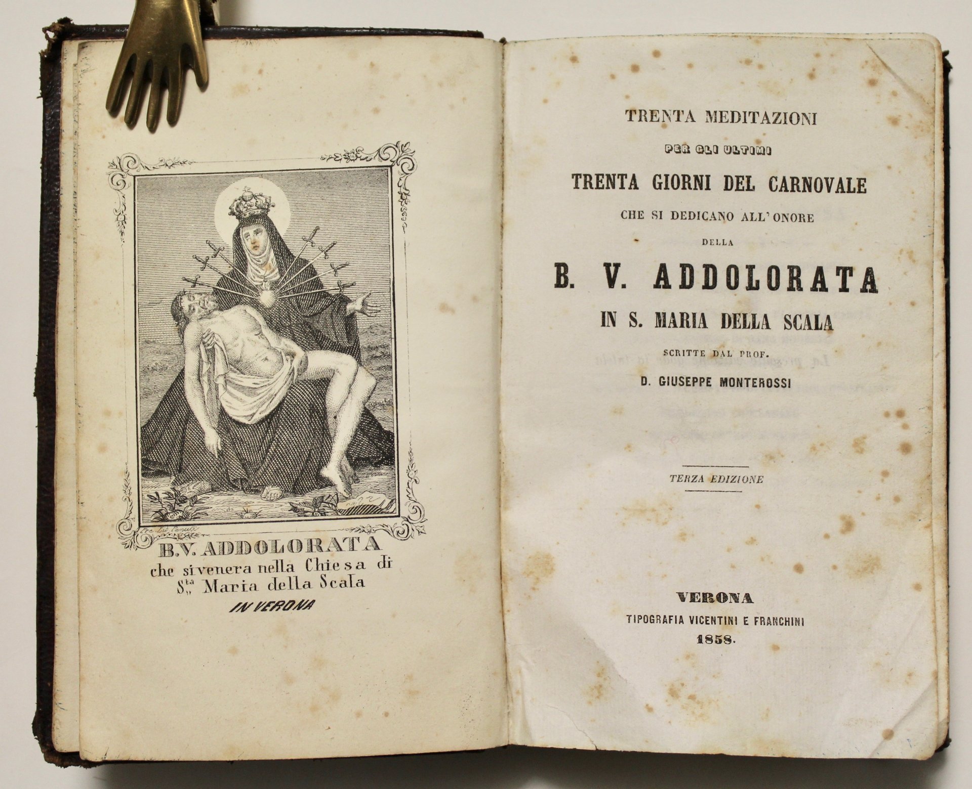 In 12° (mm 155x100); pagg. 268, (4), 48. 15 tavole incise nel testo in silografia raffiguranti le XIV stazioni della via crucis e una tavola con Maria intitolata "o Amore o Dolore"; 1 tavola in antiporta f.t. incisa in rame con l'Addolorata che si trova nella chiesa di S. Maria della Scala. Elegante piena pelle coeva con cornice dorata a losanghe ai piatti, titolo impresso in oro e piccoli ferri dorati. Cantonali con fiori e la croce ai piatti impressi a secco. Buon esemplare con minime fioriture. Raro.<BR>