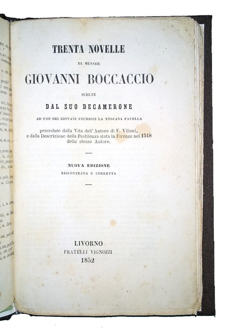 Trenta novelle di messer Giovanni Boccaccio scelte dal suo Decamerone ad uso dei giovani studiosi la Toscana favella, precedute dalla vita dell'autore di F. Villani, e dalla descrizione della pestilenza stata in Firenze nel 1348 dello stesso autore. Nuova edizione riscontrata e corretta.